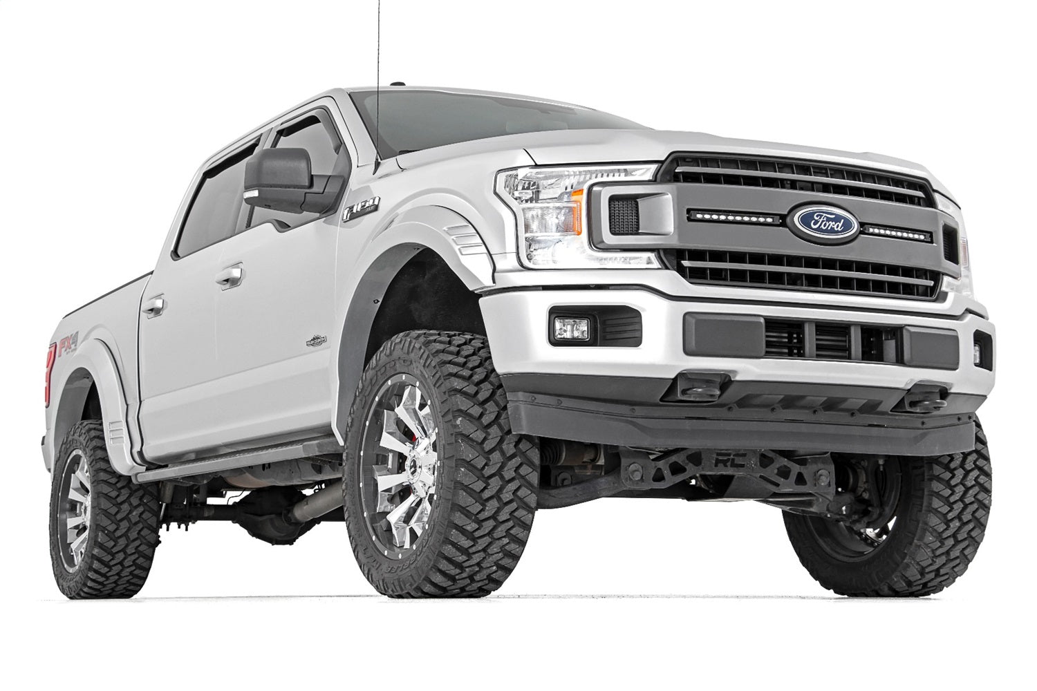 Rough Countrys SF1 Fender Flares help you get the tough-looking finishing touch that your build deserves with a one-of-a-kind design. These flares complement the trucks body lines offering a clean look that will turn heads. The SF1 flare design gives the perfect amount of additional tire coverage for an oversized wheel and tire package and feature an integrated rear ""mud catcher"" to help reduce tire sling down the truck side. They are easy to install on your F-150, with excellent fitment right out of the box and includes all necessary hardware. The construction of these flares is from a durable ABS material that is both UV resistant for an uncoated install or paint-ready for a custom color match look.Not only will you get the utility you need from these flares, but youll also have a unique and aggressive look for your truck. Whether youre looking for functionality or an accessory to tie your lift, wheels and tires together, Rough Countrys SF1 fender flares deliver on all fronts.