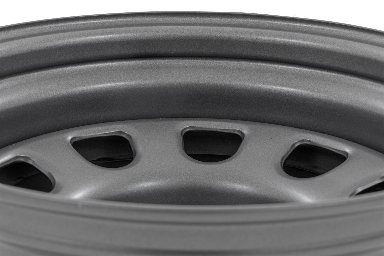 Stand-out Look. Rough Countrys Gray Steel Wheels are built for maximum durability and strength with high-performance styling that ensures that its ready to withstand anything on and off-road. This steel wheel replacement will provide you with a rugged appearance and outstanding performance that you expect from Rough Country products. Rough Countrys gray Steel wheels are the perfect setup for running a 12.50 in. wide tire with appropriate lift. Superior Design. Our Steel Wheels feature a durable gray finish and feature a 10-slot D-window design. They are constructed from heavy-duty steel for long-lasting performance. Rough Countrys Steel Wheels come with a 1-year finish and Limited Lifetime Structural Warranty.