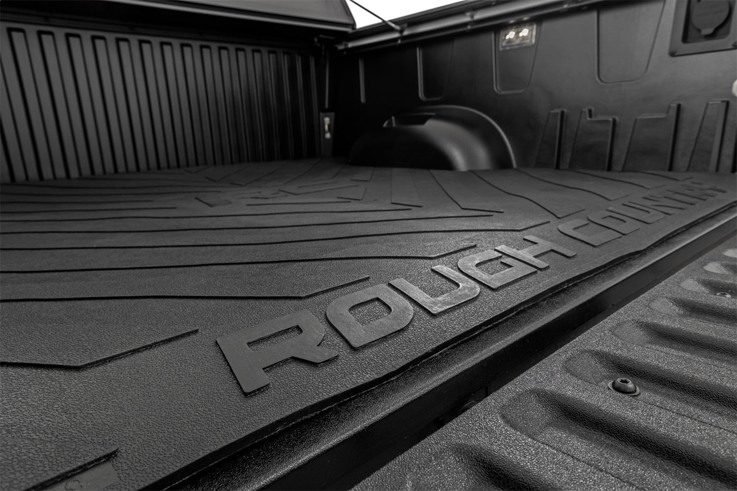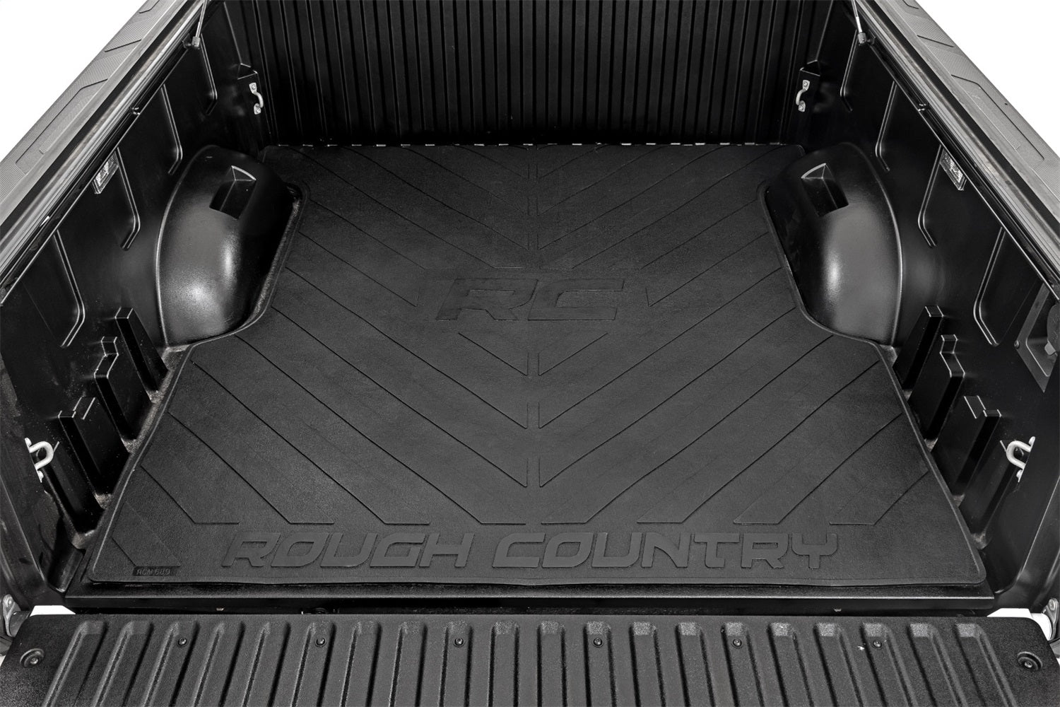 Innovative Design and Material. Keep your truck bed free from scuffs, scrapes, and scratches with Rough Country Truck Bed Mats. These heavy-duty, 3/8-inch thick, contoured rubber mats are nearly indestructible; made from a high-quality rubber compound that won't crack in extreme temperatures or fade when exposed to the sun. This stylized bed mat features a large "RC" and "Rough Country" logo with angled lines for an improved look that also protects your truck bed. Installation. With a simple drop-in design, installation couldnt be easier. With an estimated timeframe of 10 minutes, this mat can be installed at home efficiently and quickly! Simply place the bed mat in, and roll it out and youre done!Limited Lifetime Replacement Warranty. Rough Countrys bed mats are backed with a limited lifetime replacement warranty towards manufacturer defects. As such, the product is protected from structural and workmanship damage after the date of purchase. With our industry-leading warranty give yourself peace of mind when using Rough Country products!