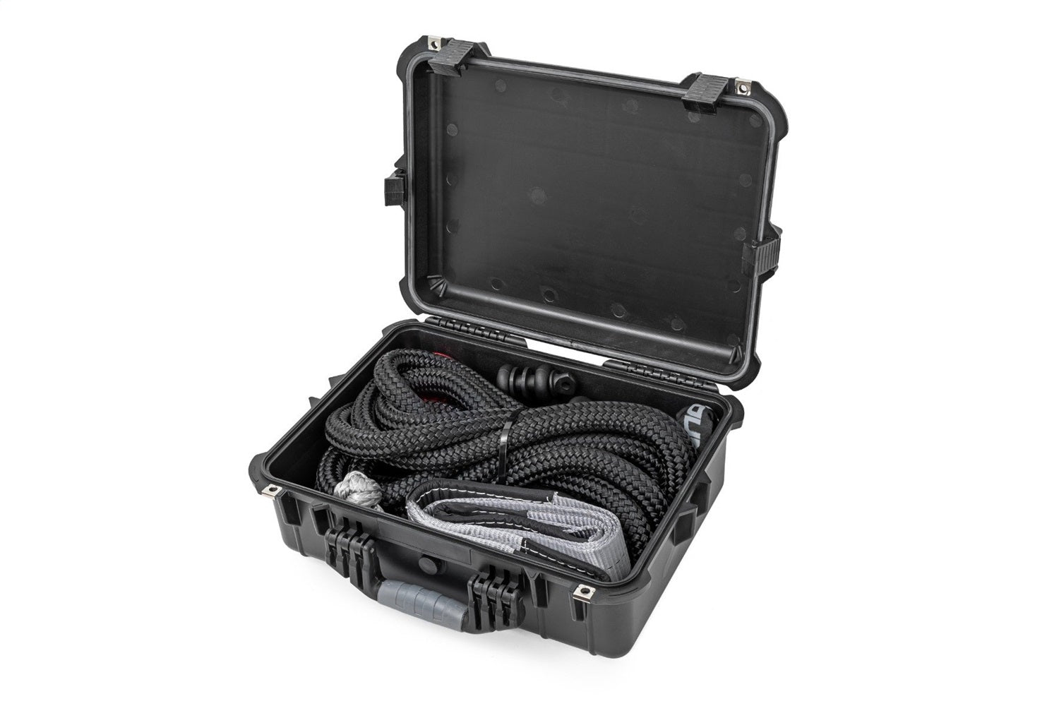 Got a winch but missing the muscle to get the job done? Rough Country's Winch Recovery Kit is your one-stop shop for turning your winch into a recovery powerhouse. This kit provides all the essential gear to tackle tough situations on your own terms so you can get back to enjoying the ride. Packed with must-have items like a Kinetic Rope, Tree Saver, D-rings, and more, this kit ensures you're prepared for any terrain challenges. Plus, it all comes neatly organized in a waterproof, impact-resistant polymer carry case, so you can easily store it in your vehicle without worrying about damage. Stay prepared and conquer the trail with Rough Country's Winch Recovery Kit.