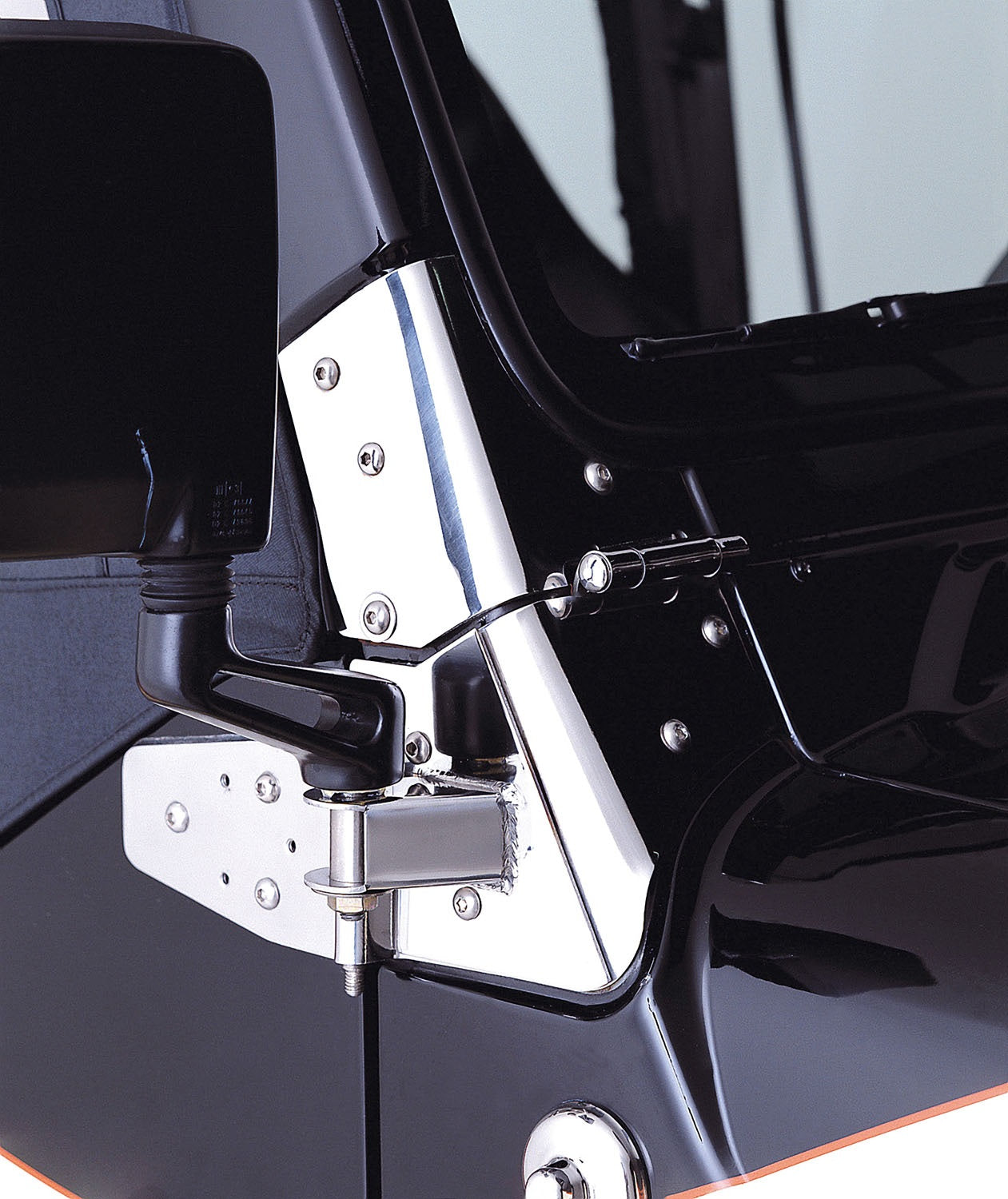 This pair of stainless steel mirror relocation brackets from Rugged Ridge fit 97-06 Jeep Wrangler with factory half doors or full doors.