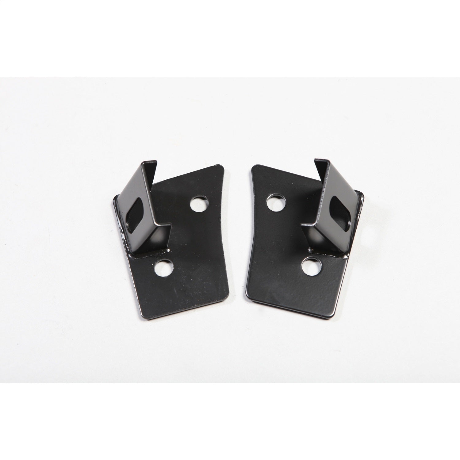 This pair of black windshield auxiliary light mounting brackets from Rugged Ridge bolts to the windshield hinges. They fit 07-16 Jeep Wrangler.