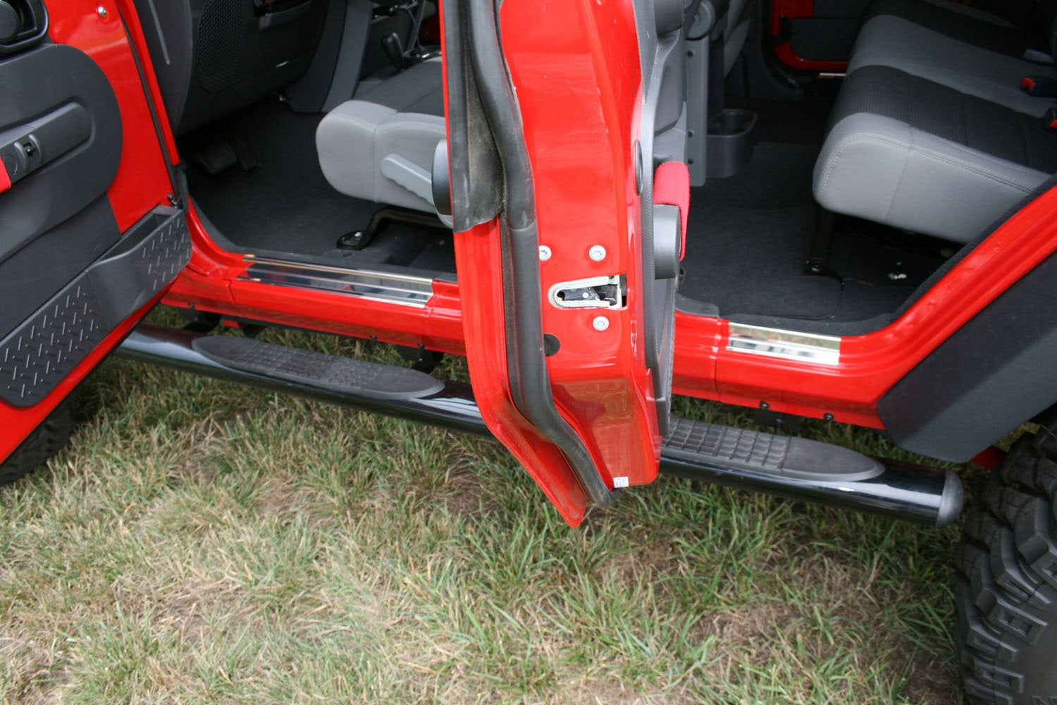 Protect your door threshold with these stylish entry guards. Available in three different finishes, black, polished stainless, and aluminum to enhance the look of your Jeep while providing the ultimate in protection. 2007-2013 Wrangler entry guards available for 2 and 4-Door models (2-door kits will fit front 4-door applications) 07-13 Wrangler models attach without screws using durable double sided automotive grade adhesive.
