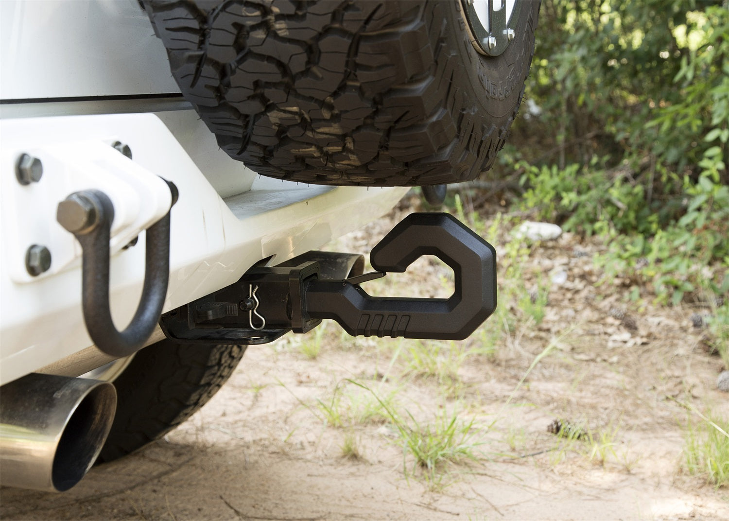 This black Elite Giga Hook from Rugged Ridge fits vehicles with 2inch receivers.