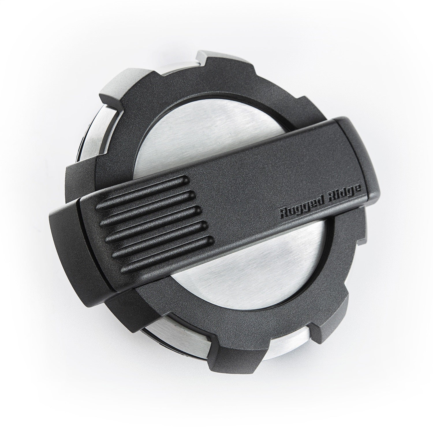 This non-locking brushed aluminum finish gas cap door from Rugged Ridge fits 07-18 Jeep Wrangler JK/JKU. US Patent No. D816,005.