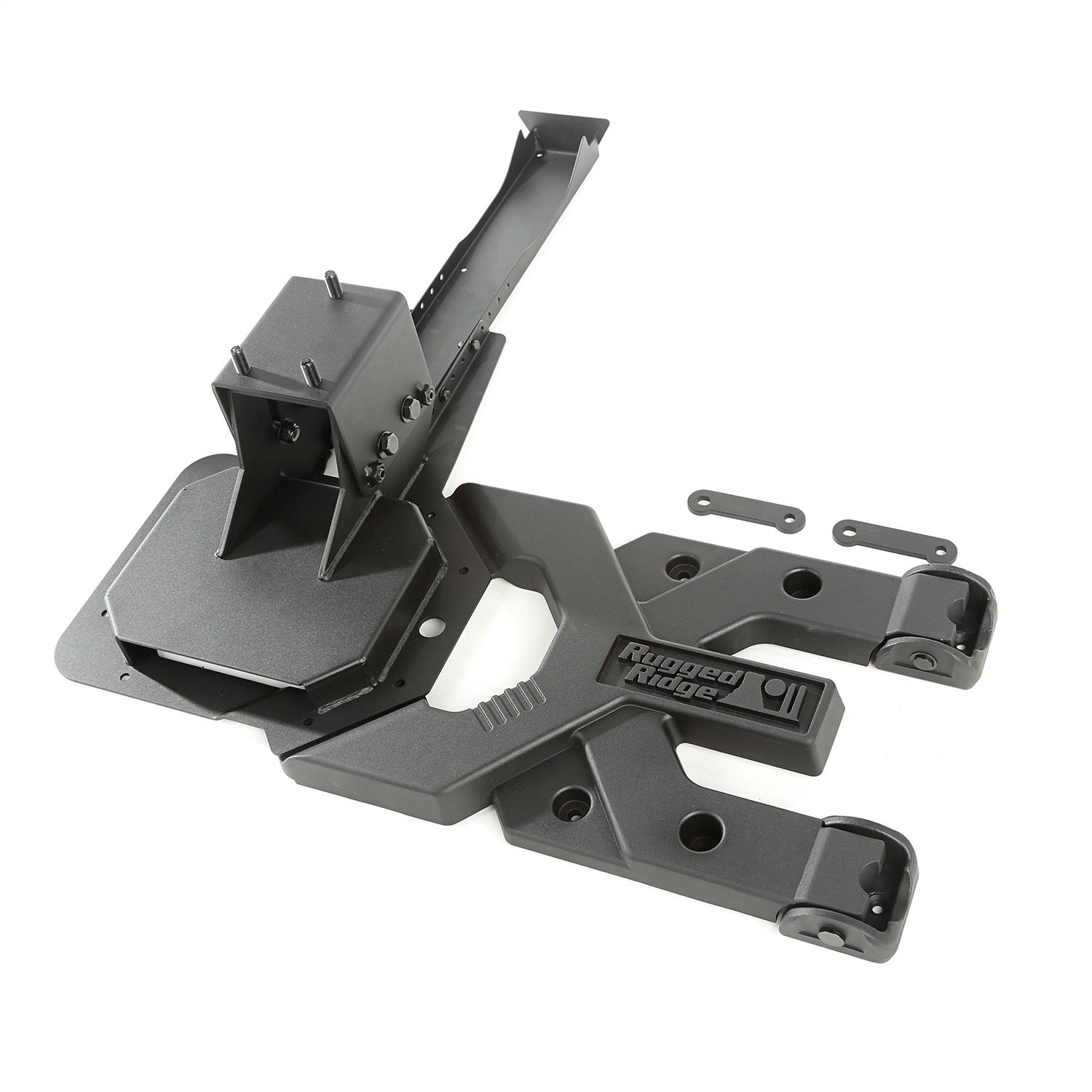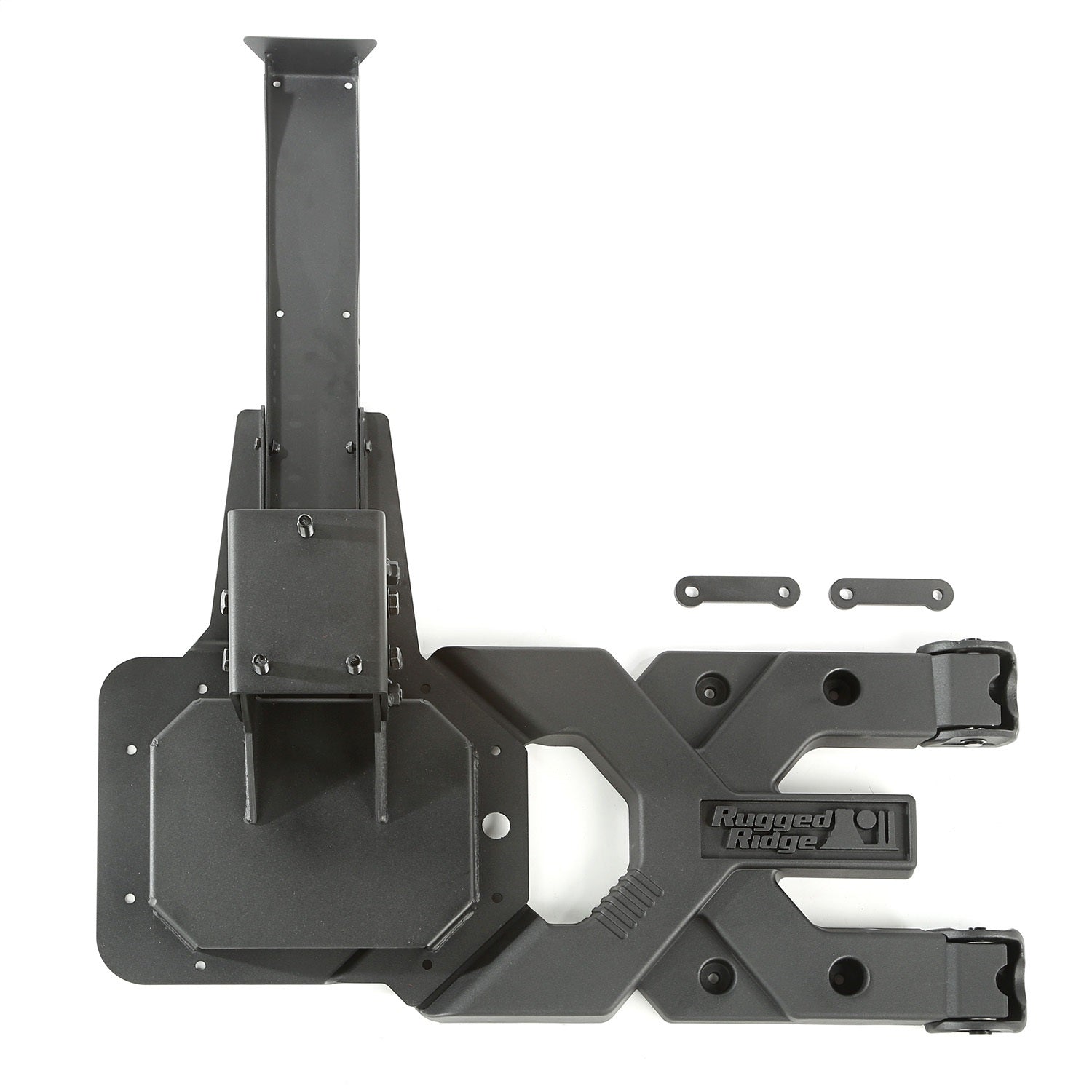 This heavy-duty tire carrier kit from Rugged Ridge fits 07-18 Jeep Wrangler JK.