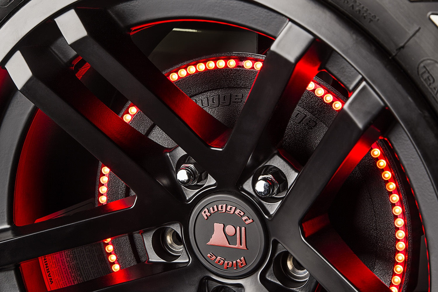 The third brake light LED ring from Rugged Ridge fits wheels with 5 by 4.5 and 5 by 5 inch lug patterns.
