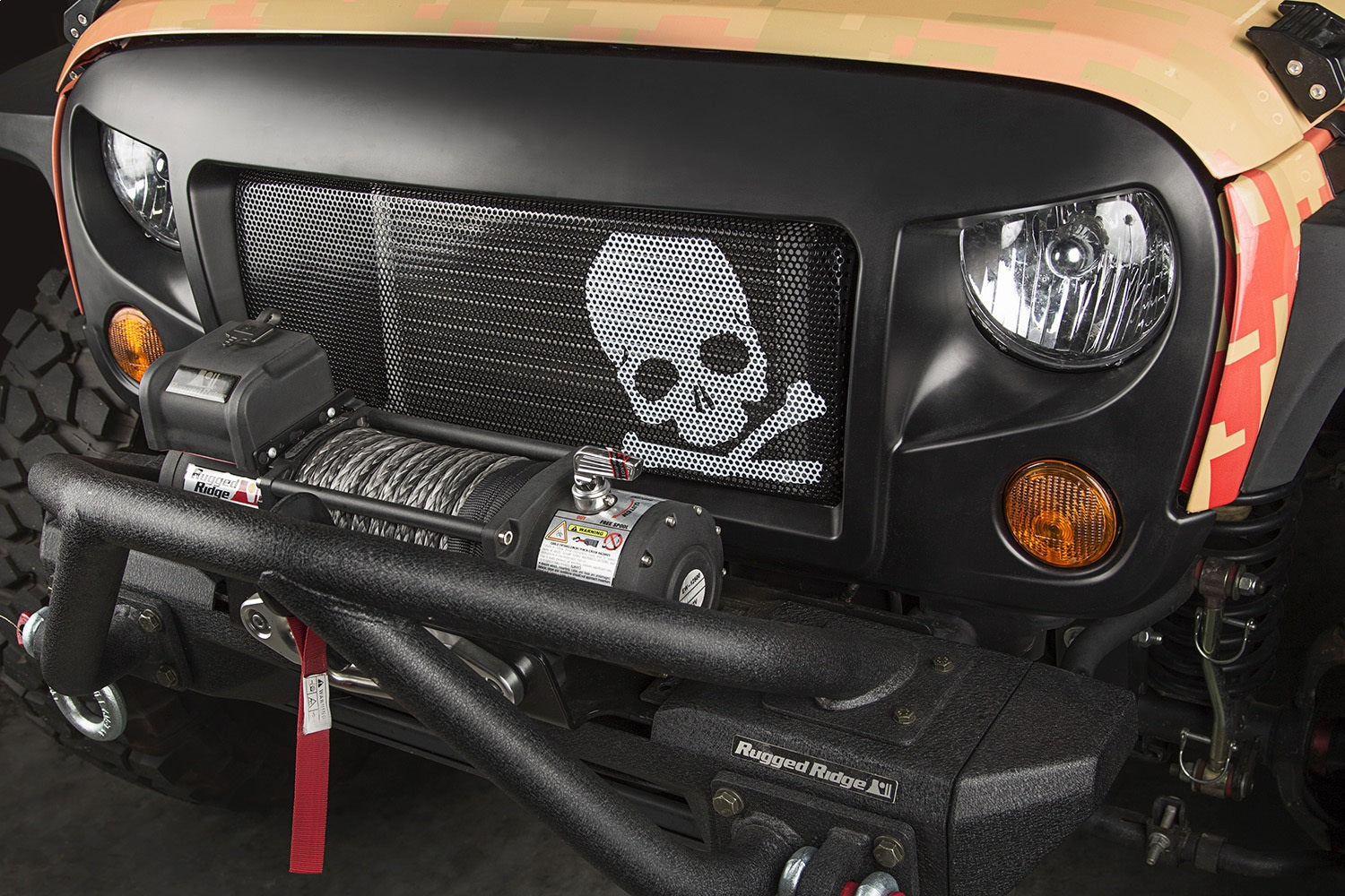 This Rugged Ridge Spartan Grille kit combines the exclusive styling of the easily paintable and injection molded Rugged Ridge Spartan Grille with a high profile and custom fit interchangeable steel mesh insert that features a skull and crossbones for a tough off-road look. Ranging from mild to wild, each Spartan Grille kit allows you to further customize your Jeep's exterior. Patent No. D749,995.