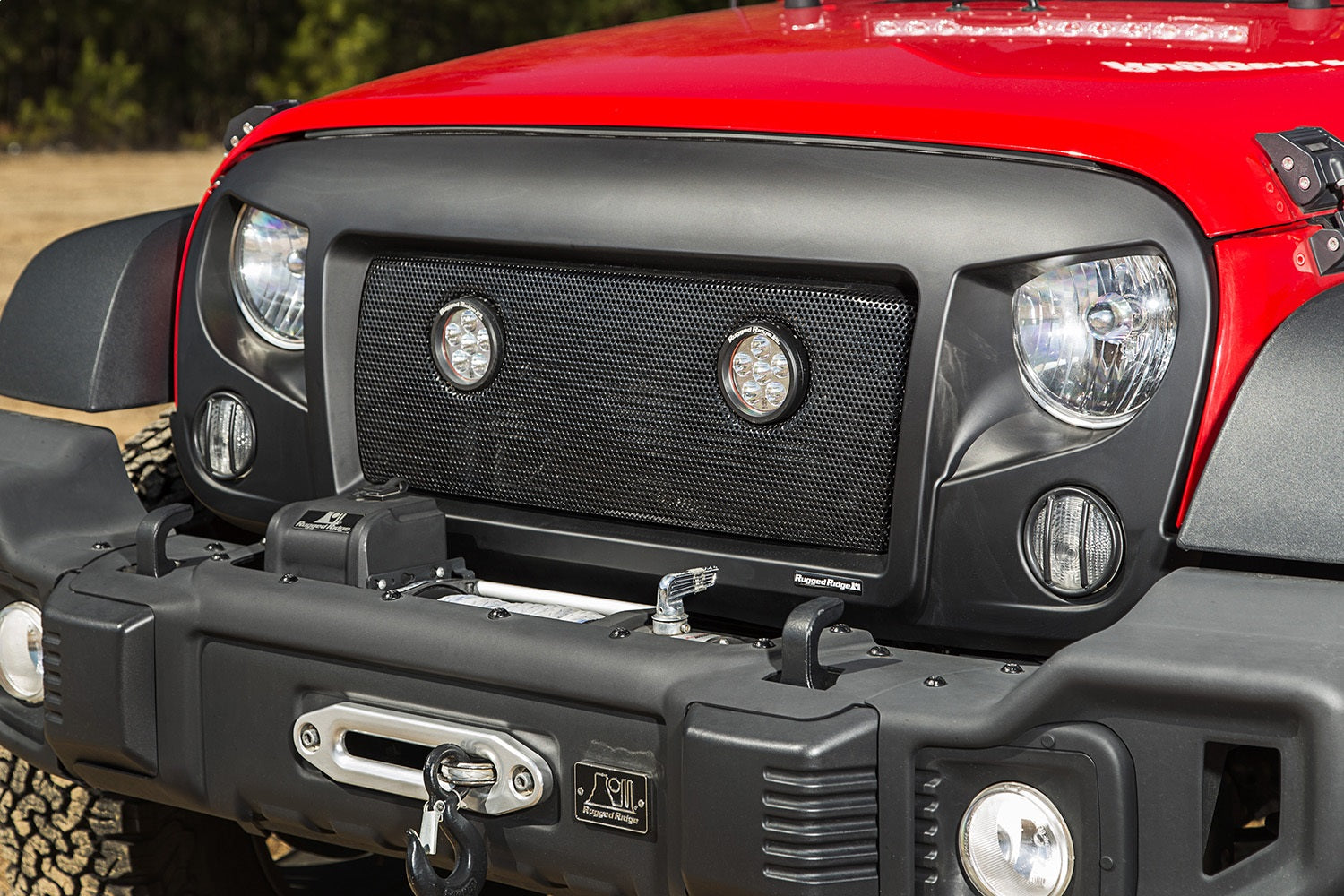 This Rugged Ridge Spartan Grille kit combines the exclusive styling of the easily paintable and injection molded Rugged Ridge Spartan Grille with a high profile and custom fit interchangeable steel mesh insert that features two 3.5 in. round LED lights (included) for a tough off-road look. Ranging from mild to wild, each Spartan Grille kit allows you to further customize your Jeep's exterior. Patent No. D749,995.