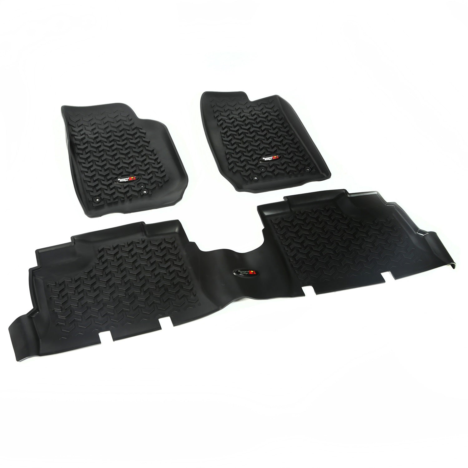 This 3 piece black All Terrain Floor Liner kit from Rugged Ridge fits 2007-2016 Jeep 4-door Wrangler. Includes front and 2nd row liners.