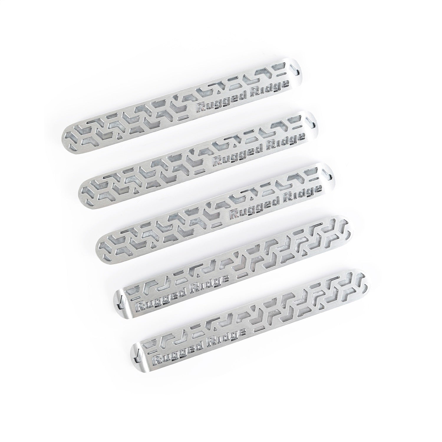 Bring a tasteful off-road accent to your JKU with Rugged Ridge Elite Door Handle Inserts featuring a cool tread-inspired inlay. Each insert is made from lightweight cast aluminum with a lustrous brushed finish giving an eye-catching custom touch to your rig.. Kit Includes 5 inserts, for all doors and rear tailgate. These inserts install with ease with double-sided automotive tape. No sharp edges result in a comfort-fitting install.