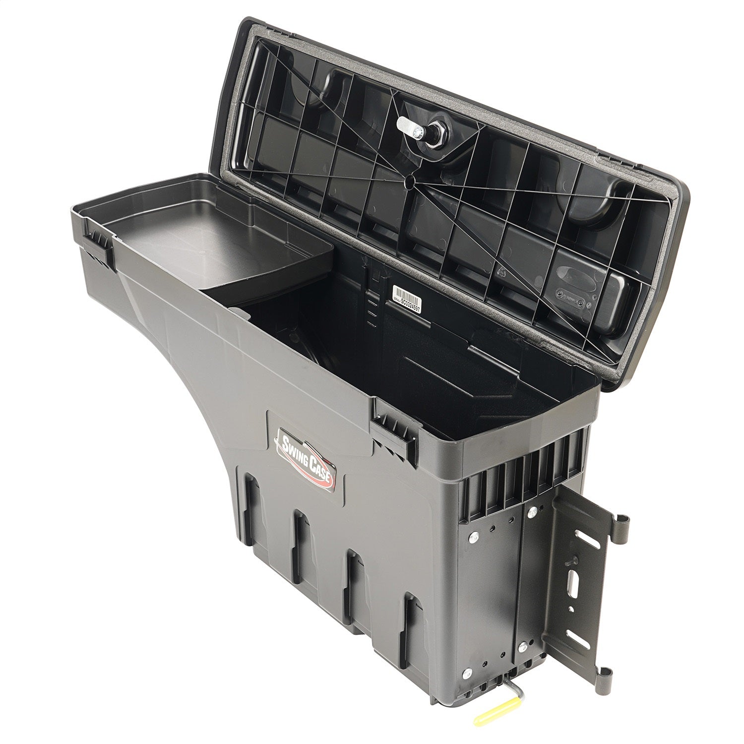 Equipping your Gladiator for adventure has just gotten easier! The Rugged Ridge Armis Swing Case makes it easy to access all of your gear, tools, or whatever you choose to carry in a safe and convenient location just inside your JT's tailgate. The sleek pull-action lever gives smooth access to the Armis Swing Case without the need to climb into the bed. With just a touch, the Armis Swing Case rotates outward to you for almost-effortless loading. Constructed from a lightweight, high-impact ABS plastic, the Armis Swing Case is tough, weather-resistant and custom-fitted specifically for the Gladiator. The Armis Swing Case is a premium yet affordable storage solution and is backed by a Limited 5-Year Warranty.