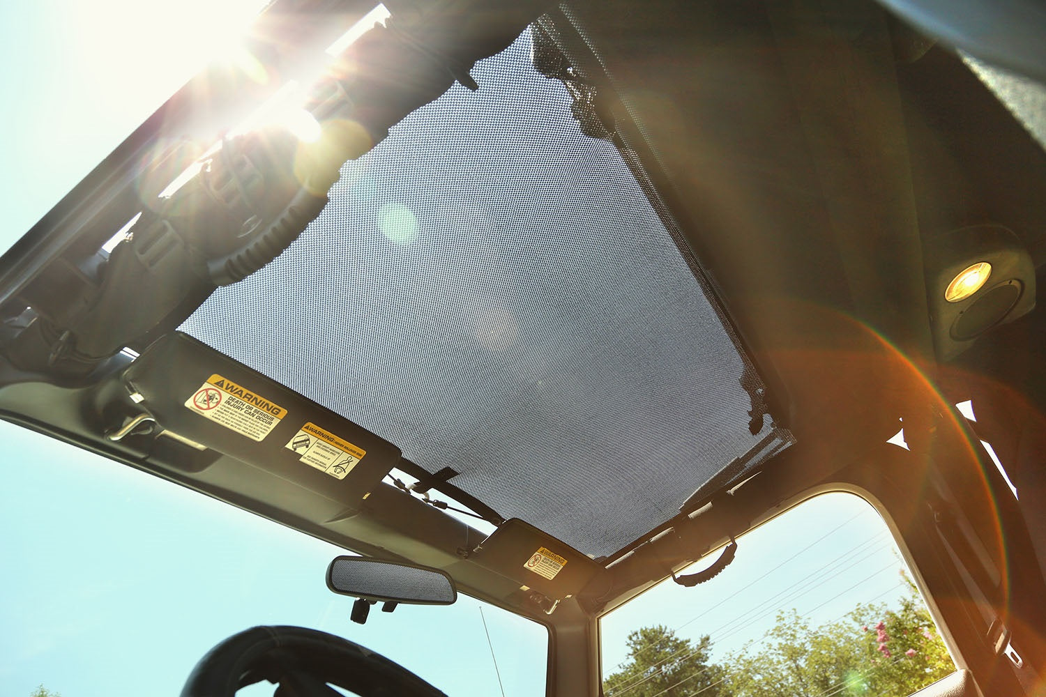 Craving that top down experience in your Jeep, but still want protection from harsh sunlight? This full-length shade protects both front and rear passengers from the sun while offering a top down feeling. With mesh construction, this sun shade is held between the windshield and the rear crossbar, eliminating the need for a header channel. The built-in elastic straps allows this design to retain access to the Jeep's top clamps, so you can keep the shade in place and still use the factory top.