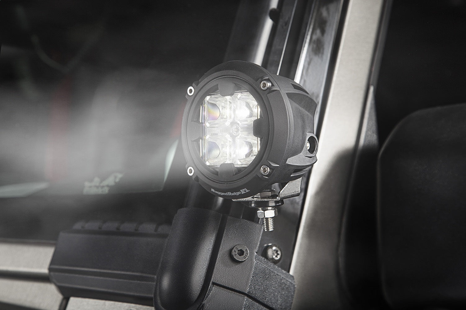 No Jeep or off-road vehicle is complete without a full array of off-road lights and no light is more efficient at lighting your path than an LED. Rugged Ridge now offers an innovative LED light that provides that searing nighttime illumination accented by a functional and cool-looking running lamp allowing you to be seen without blinding other drivers. Each LED is constructed of a virtually indestructible black thermoplastic case that houses four bright white high-beam LEDs with a single center-mounted amber low-beam LED illuminating a unique ?cross-hair designed reflector giving you greater visibility in low light conditions. With a high-quality Fresnel optic lens and an IP-67 Waterproof rating, these LEDs are built to provide years of outstanding performance making them the perfect complement to your existing light package or as a standalone lighting option. Rugged Ridge Combo LED Lights are available with Cube or Round housings to fit any application or suit any taste. Main white bean is 900 lumens.