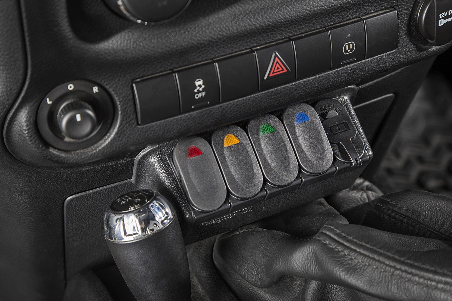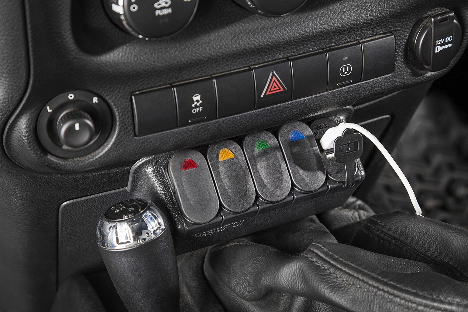 This lower switch panel kit from Rugged Ridge fits 11-18 Jeep Wrangler JK with an auto or manual transmission. Includes a switch panel and four rocker switches