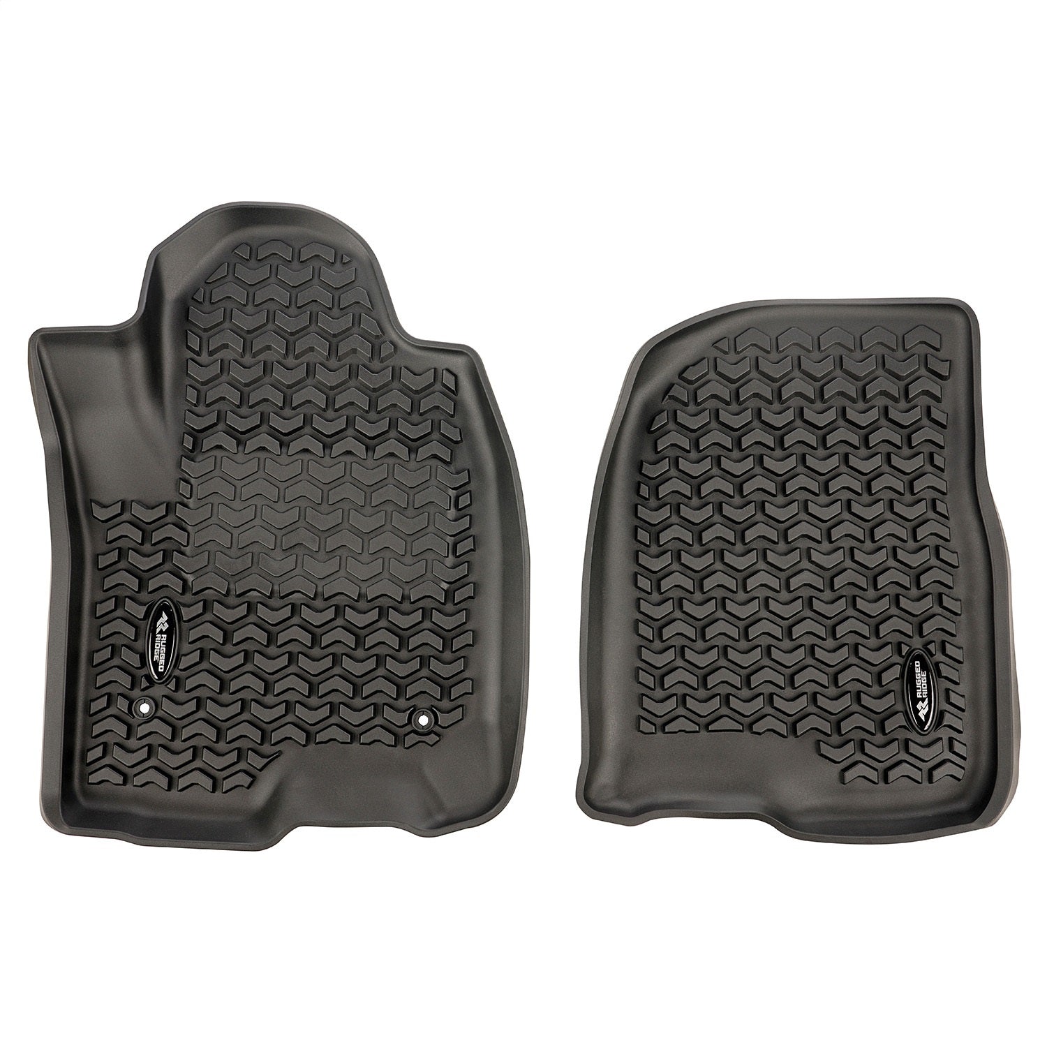 Rugged Ridge Floor liners provide complete protection for the cabin floor of your vehicle while keeping it looking factory fresh. Each liner is perfectly contoured to your vehicle's floor for precise secure fitment (floor hook attachment where applicable). The raised lip captures all spills, water and debris keeping your interior pristine. The Chevron-shape patented Deep Tread Technology channels liquid away from your shoes keeping them dry. Made of a durable OE-quality Thermoplastic material that can withstand the rigor of daily abuse. Backed by our Limited Lifetime Warranty. Patent No. 8,163,369; D627,285; 2,699,641