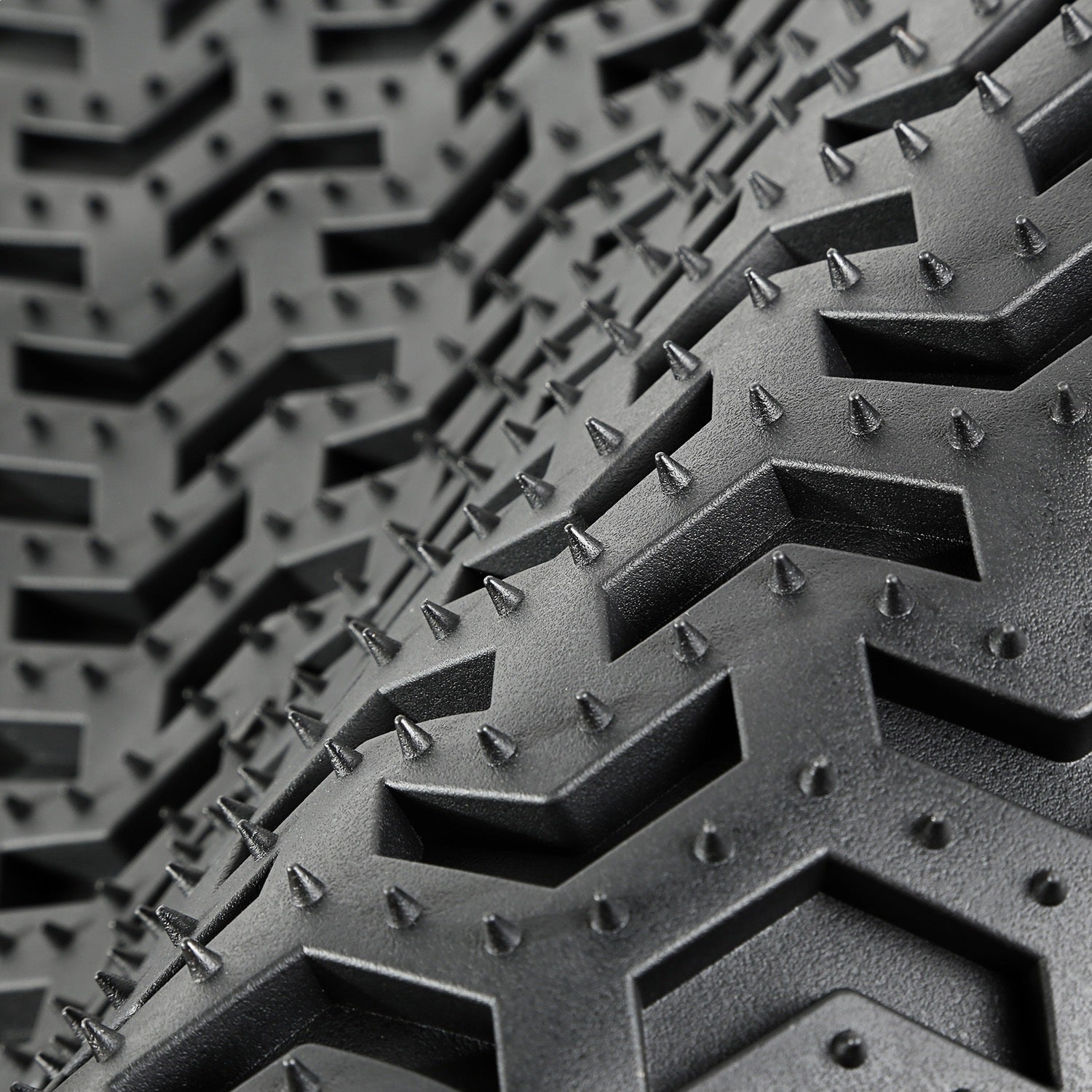 This pair of black front floor liners from Rugged Ridge provides complete protection for the cabin floor of your vehicle while keeping it looking factory fresh. Each liner is perfectly contoured to your vehicle's floor for precise secure fitment (floor hook attachment where applicable). The raised lip captures all spills, water and debris keeping your interior pristine. The chevron-shape patented deep tread technology channels liquid away from your shoes keeping them dry. Made of a durable OE-quality thermoplastic material that can withstand the rigor of daily abuse. Backed by our limited lifetime warranty.