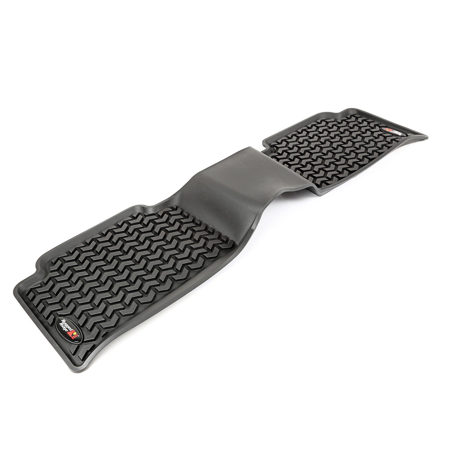 Need an affordable solution to keep the floors of your vehicle looking factory fresh? Rugged Ridge has you covered with this rear set of black floor liners. Featuring a durable OE-quality thermoplastic material that can withstand the rigor of daily abuse, each liner is perfectly contoured to your vehicle's floor for precise secure fitment (floor hook attachment where applicable). The raised lip captures all spills, water and debris keeping your interior pristine. Features a chevron shape patented deep tread technology