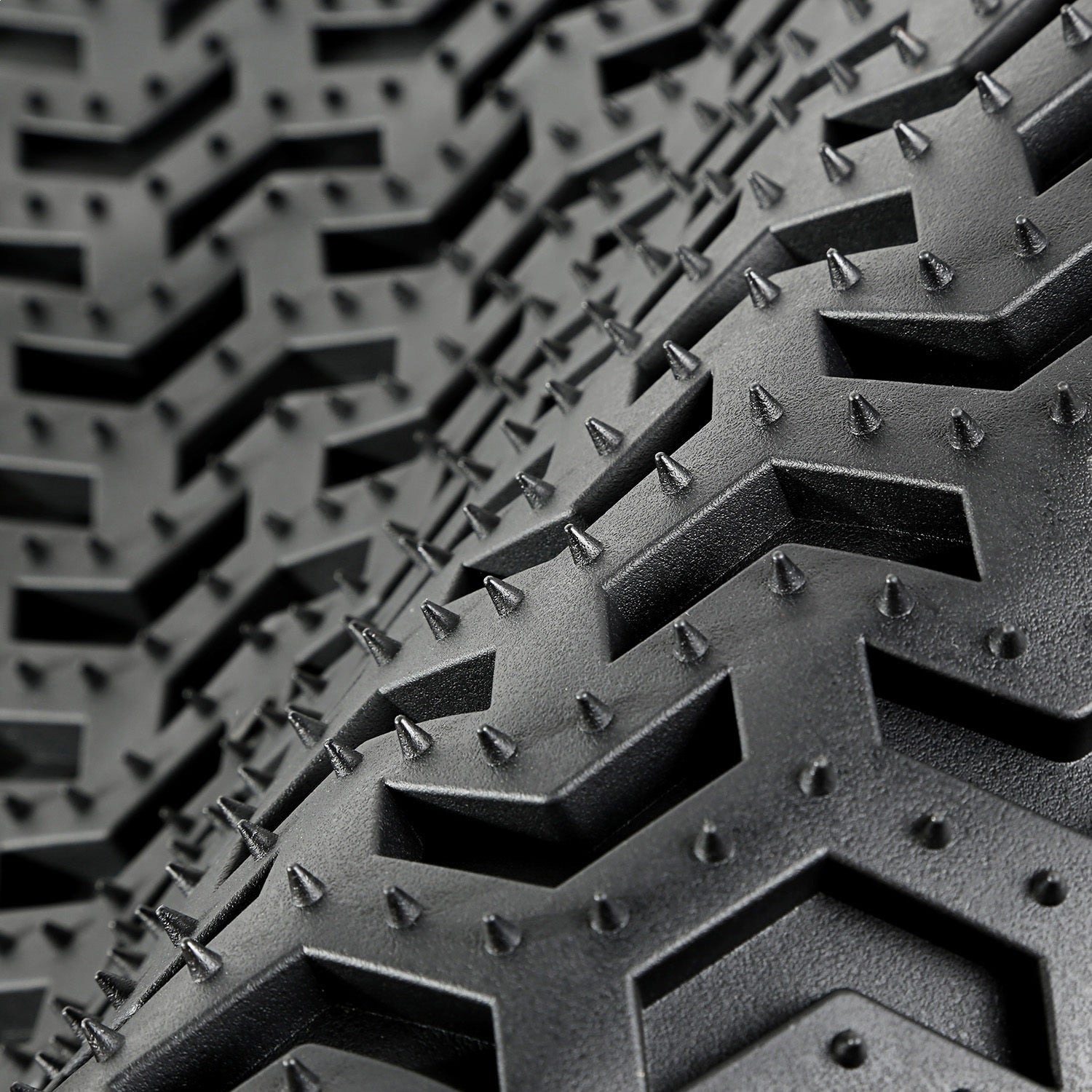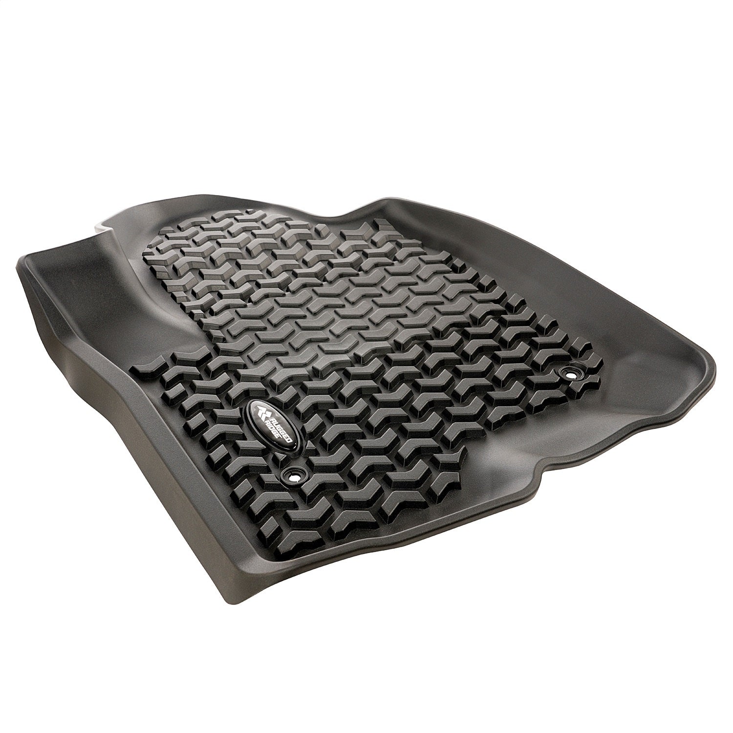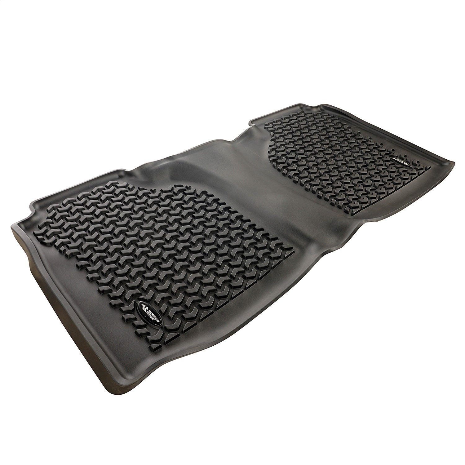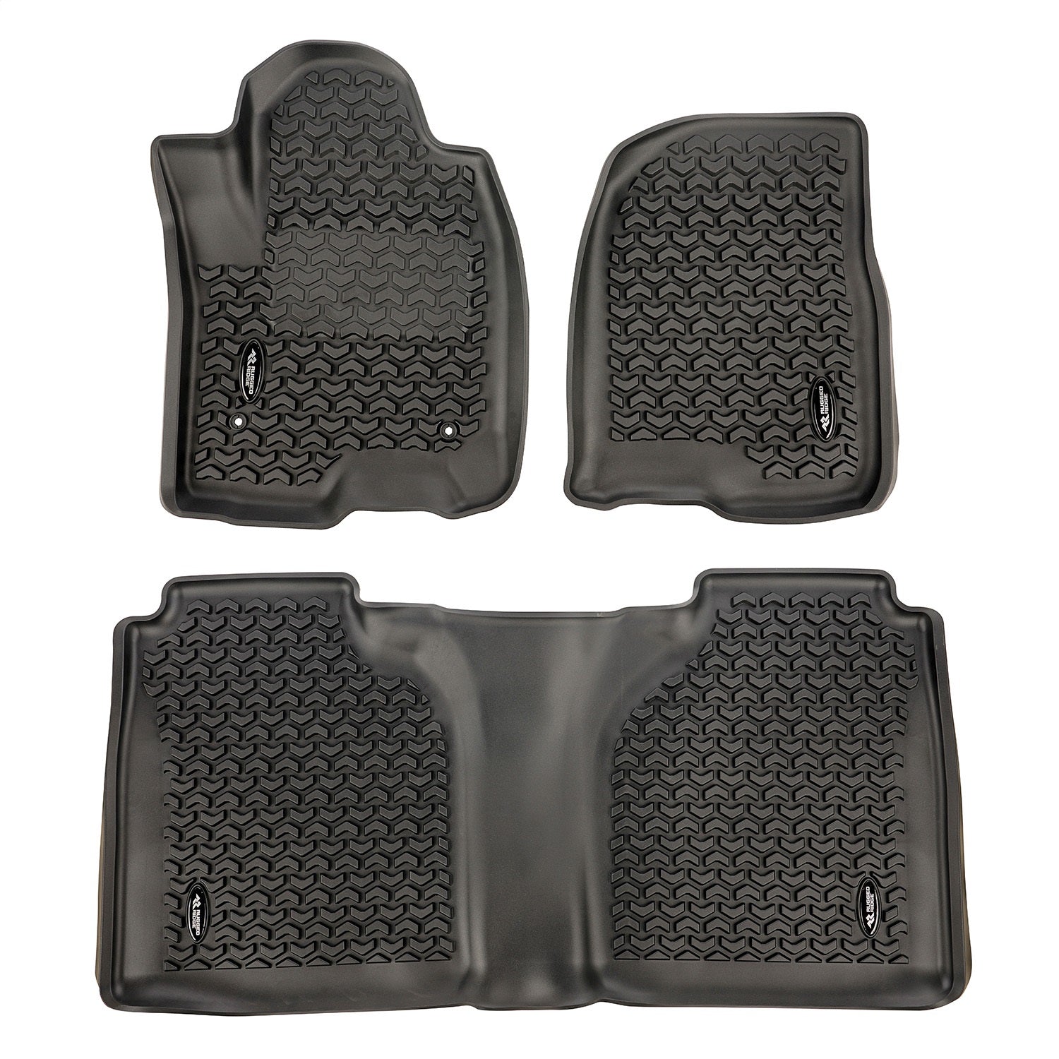 Rugged Ridge Floor liners provide complete protection for the cabin floor of your vehicle while keeping it looking factory fresh. Each liner is perfectly contoured to your vehicle's floor for precise secure fitment (floor hook attachment where applicable). The raised lip captures all spills, water and debris keeping your interior pristine. The Chevron-shape patented Deep Tread Technology channels liquid away from your shoes keeping them dry. Made of a durable OE-quality Thermoplastic material that can withstand the rigor of daily abuse. Backed by our Limited Lifetime Warranty. Patent No. 8,163,369; D627,285; 2,699,641