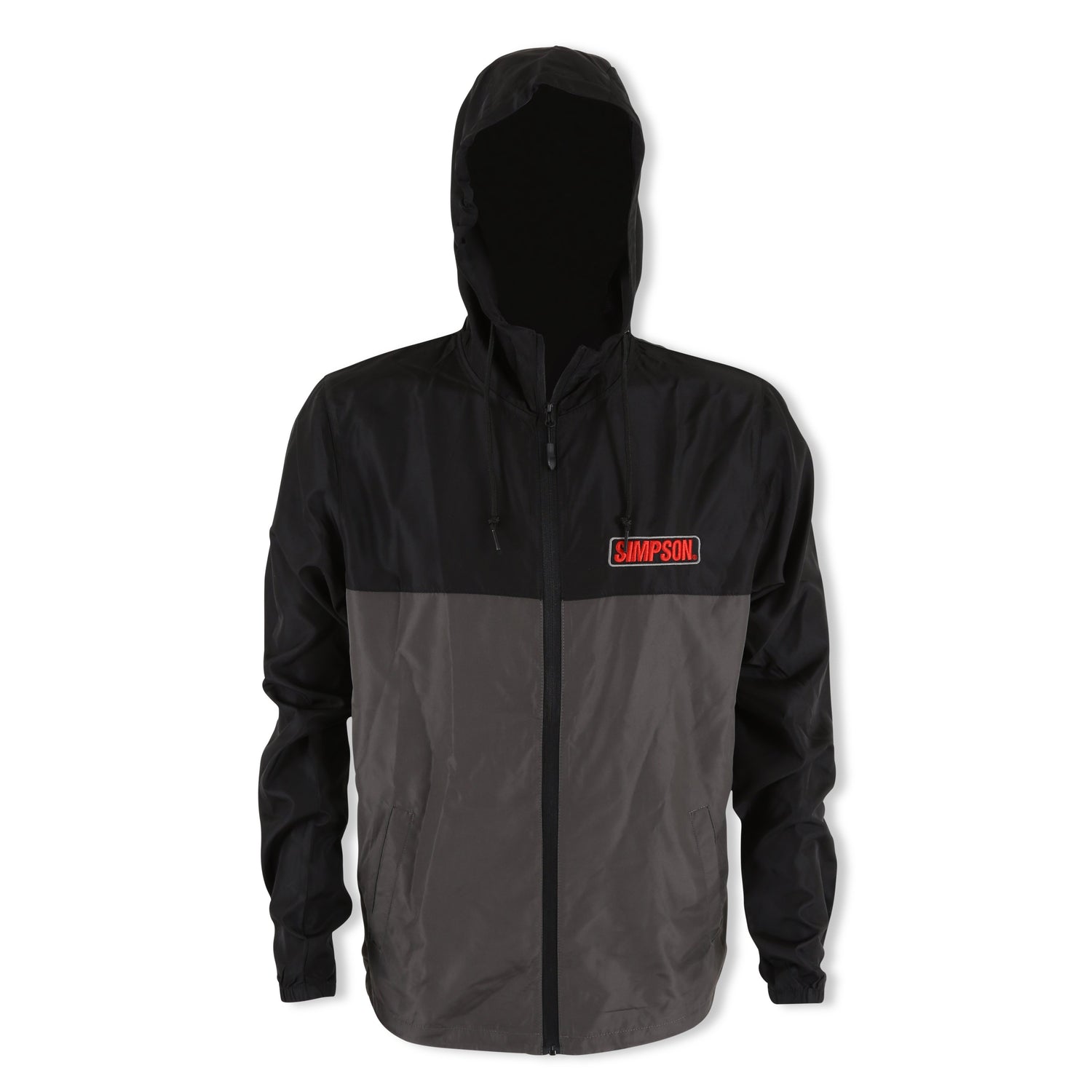 Great looking windbreaker with full front zipper, drawstring hood, and two-tone colors to wear everywhere.