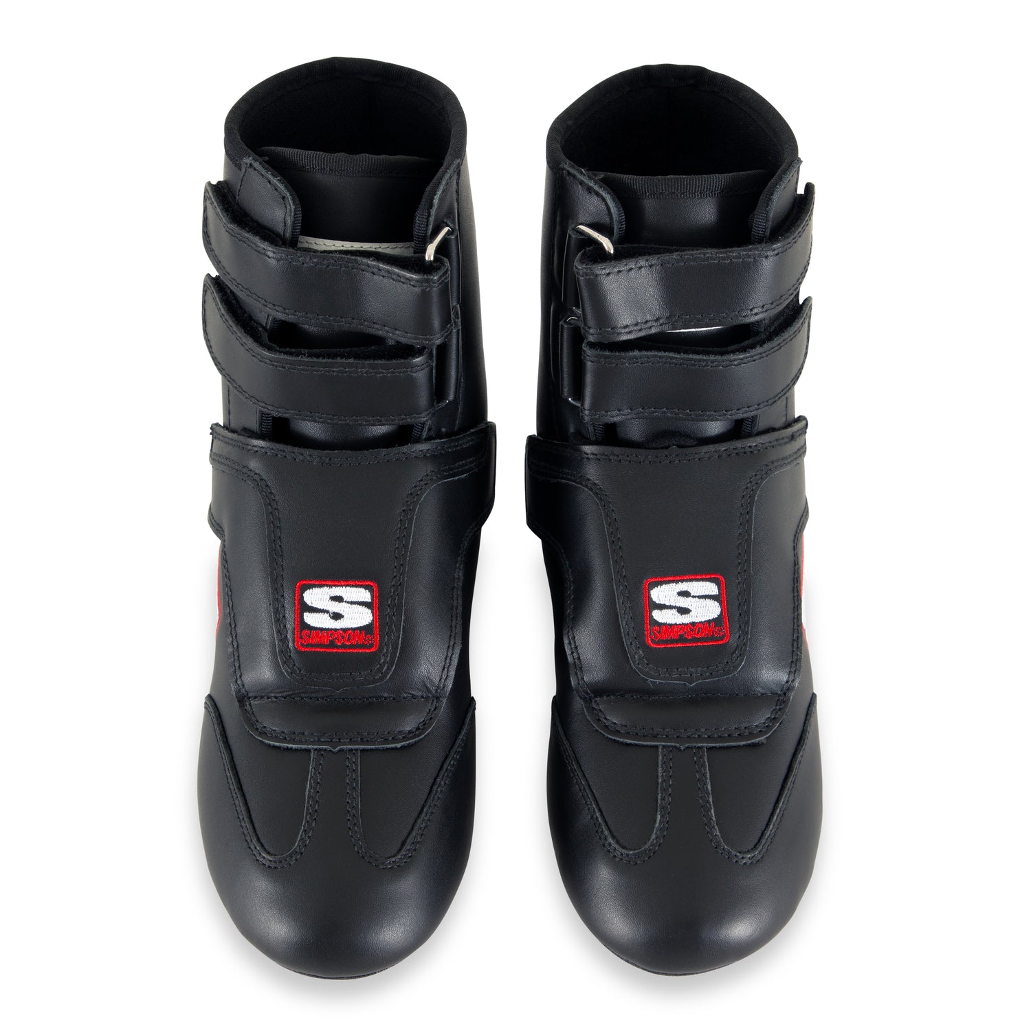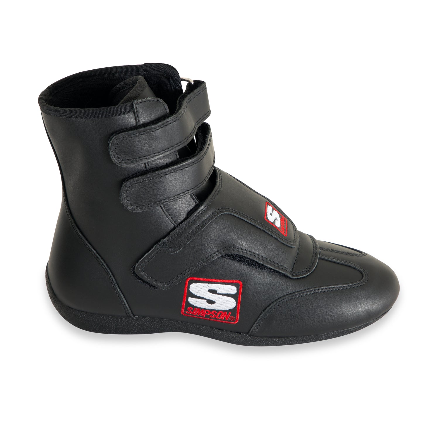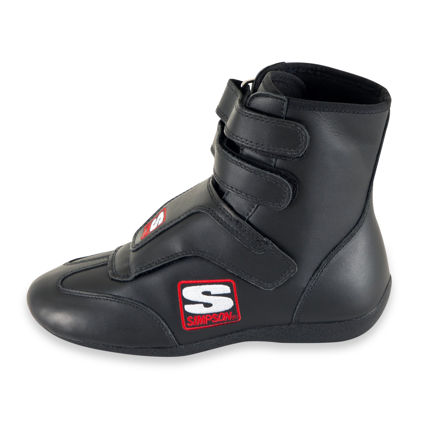 Simpson has updated their classic Sprint shoe to sport the Simpson S-Logo and a modified lace guard for a futuristic look. These shoes are SFI 3.3/5 certified and include the SFI tag. They feature a high top design with an easy to clean leather upper that is improved and softer. Simpson's exclusive EnviroGuard lace cover hinges at the tongue base with full length speedfit closures on each side. Other design features include: Fleece Nomex lined with flat seams and athletic insert. Super smooth leather toe, lace, and heel guard reinforcements. Type R polyurethane sole with posi-grip pattern. Seven hole lace-up with dual speedfit closure and lace guard. Adjustable wrap-around ankle support. Sloping achilles heel design.