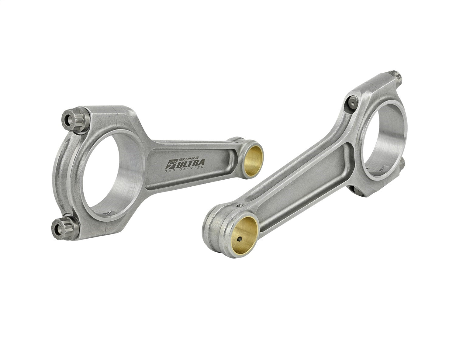Skunk2 Racing Ultra rods are manufactured from forged 4340 Chromoly steel then heat treated for ultimate strength. Skunk2 Racing Ultra rods are an x-beam style which greatly reduces weight while maintaining strength by removing material and strategically shaping the beam. This results in a very high strength to weight ratio and is great for circuit and drag racing. The ribs / straps on the pin end increase strength and stiffness under high loads and engine speeds. The step on the big end (crank journal side) is for strength and rigidity to maintain roundness.