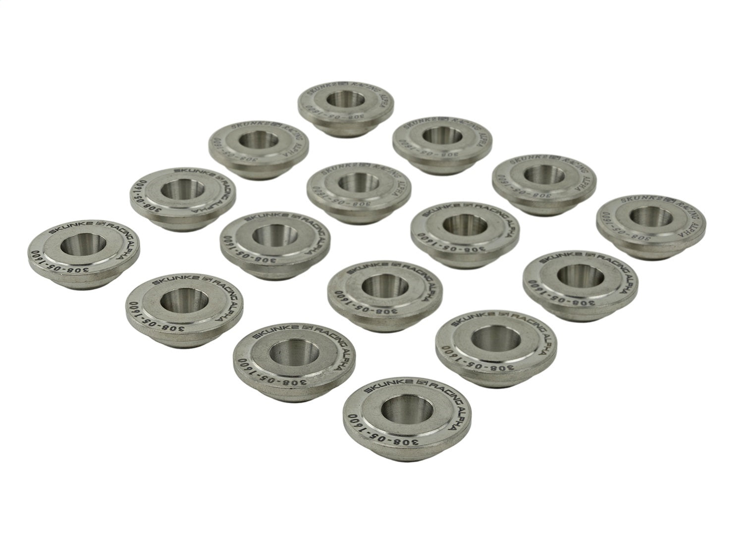 Skunk2's industry-leading Alpha Titanium Retainers for the Honda D Series engines are designed to significantly reduce valvetrain mass, resulting in more horsepower and improved valvetrain stability. Similar to Skunk2's already popular Pro Series Titanium Retainers, Alpha Titanium Retainers feature radius-cut edges for additional rocker arm clearance and reduced weight, strategically positioned lightening grooves, and reduced overall heights for better valve seal clearance and even further weight reduction. Alpha Titanium Retainers are manufactured using the latest 3D CAD (Computer Aided Design) and FEA (Finite Element Analysis) to ensure that each is optimized for strength as well as for reduced weight. Skunk2 engineers then test and prove their designs on the engine dyno as well as the race track. Once approved for manufacturing, only medical-grade titanium that's been ultrasonically inspected and certified is used. Following CNC machining, each retainer is then individually inspected to ensure proper hole diameter, taper, and that each are free from machining defects to ensure proper installed valve spring heights and pressures. Finally, each retainer is serialized for your protection, including valuable information, like material batch specifics as well as production and inspection dates.