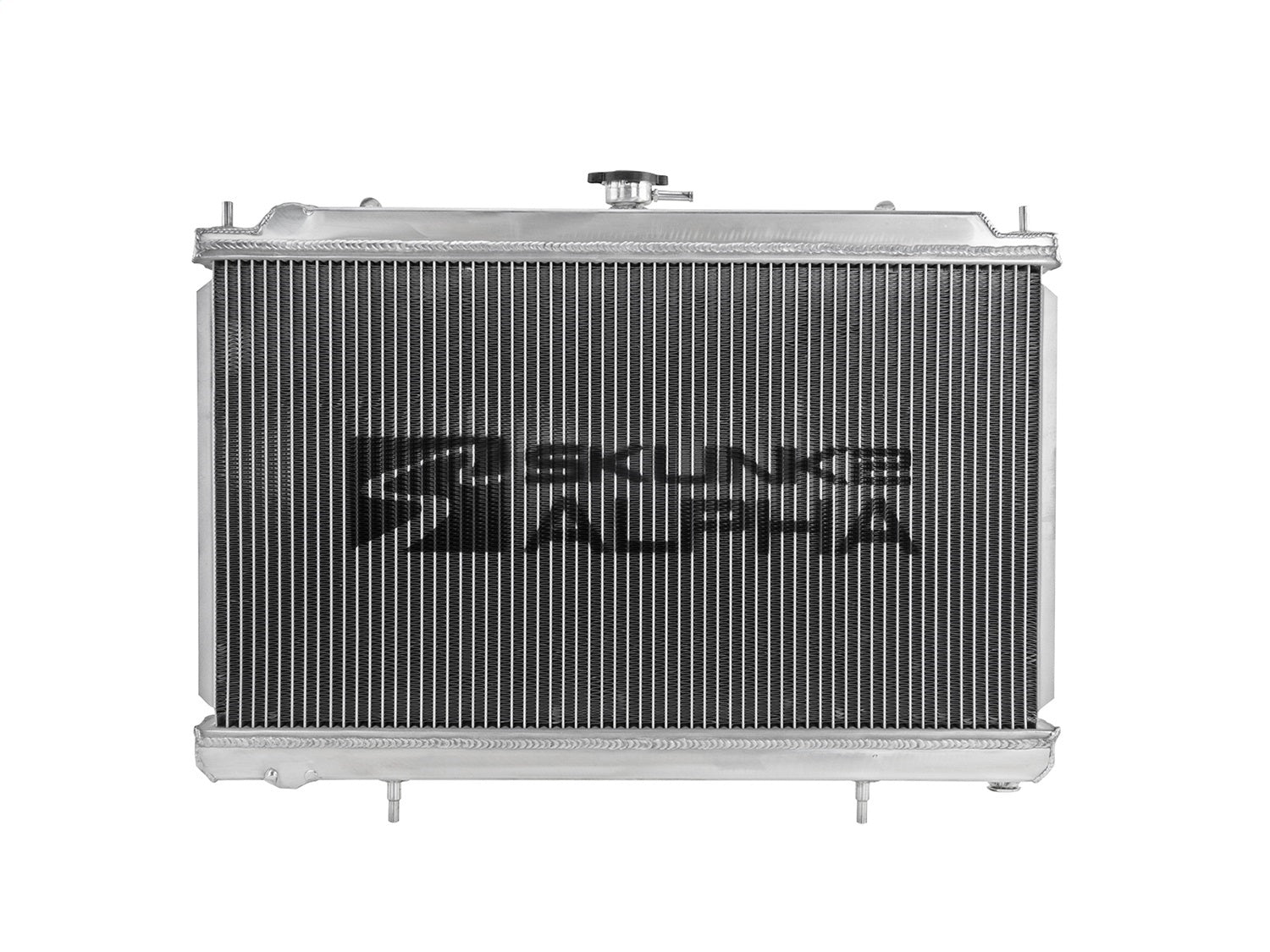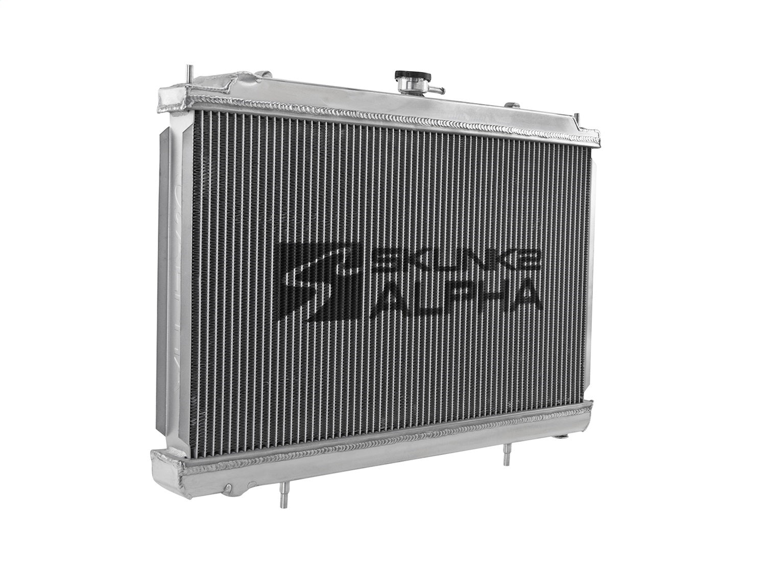 Skunk2's all-aluminum, full-size Alpha Series Radiator for the '95-'98 240sx is a direct-fit upgrade designed to dramatically increase both cooling efficiency and engine performance. Alpha Series Radiators are manufactured from lightweight and durable aluminum, feature 100-percent brazed cores, and include polished end tanks with Skunk2's signature Alpha logo embossed along each side. Each Alpha Series Radiator features a dual-core design, high-efficiency fins for maximum cooling capabilities. Each Alpha Series Radiator also includes provisions for the OEM cooling fan and OEM-compatible, 1.50- in. inlets and outlets. Skunk2's commitment to producing high-quality components means that each Alpha Series Radiator meets or exceeds original equipment manufacturer standards, that each radiator may be installed without modification to the vehicle, and is compatible with OEM hoses, cooling fans, and shrouds. (Note: Some engine swap applications may require custom radiator hoses and/or cooling fans.) Skunk2's Alpha Series Radiators are the perfect addition to any high-performance vehicle and are designed for the street, the track, or even OEM replacement purposes. Alpha Series Radiators are built to withstand harsh elements as well as against years of under-hood heat cycling. Each Alpha Series Radiator adheres to strict quality control standards and careful packaging, resulting in tubes and fins capable of optimal flow and efficient heat transfer.