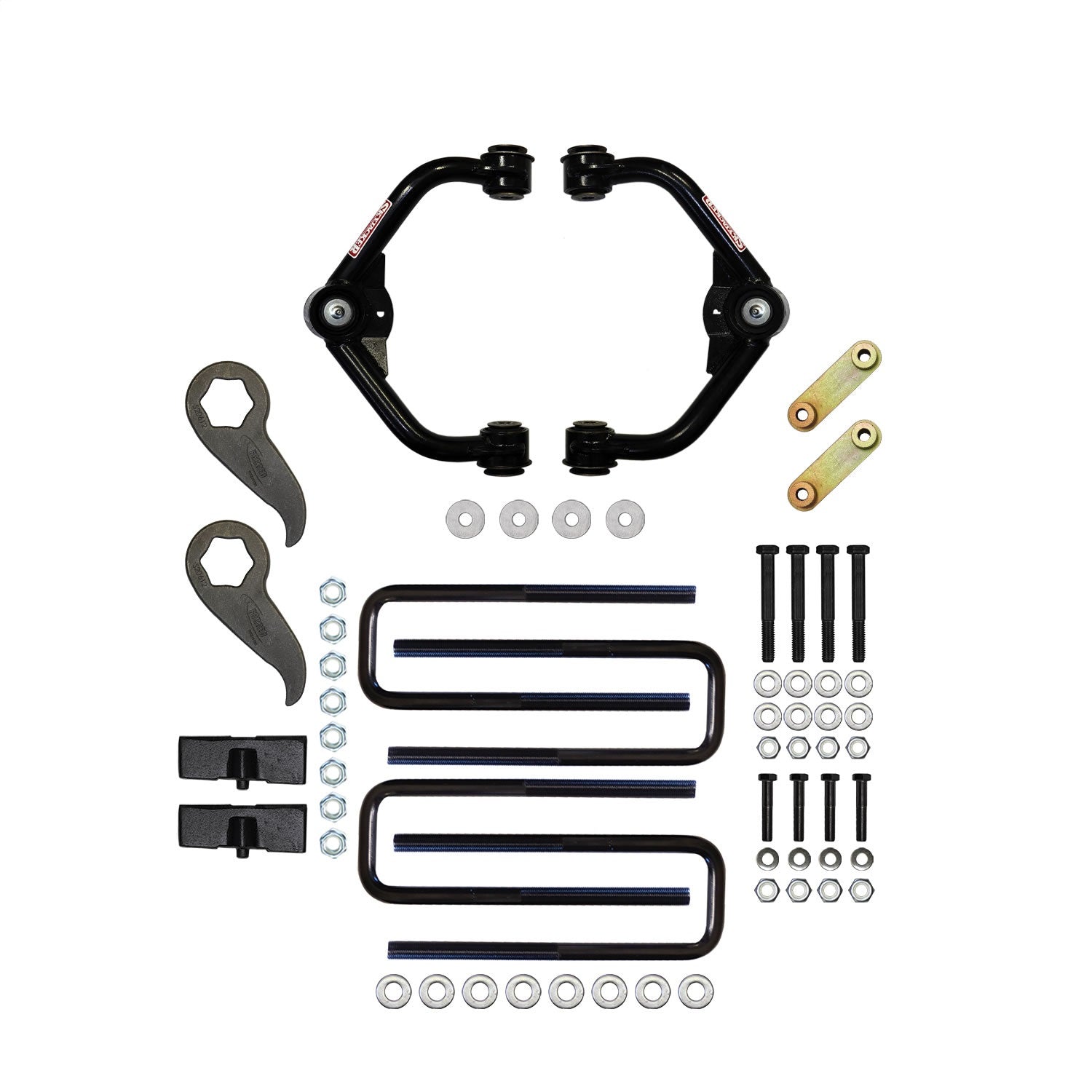 Conquer your daily driving adventures and tough off-road terrains with new control. Whether you are getting work done or towing to your next outdoor adventure, Skyjackers fully bolt-on 3.5-inch Lift with Replacement Upper Control Arms (UCA) goes beyond just styling into On-Road Refinement and Off-Road Readiness. Skyjacker fabricated the replacement UCA out of high weld strength, thick walled DOM steel tubing to withstand extreme amounts of stress and loads. For additional rigidity and strength, a welded gusset plate stiffens the arm and bushing eyelets into one. CNC machined bushing eyelets and ball joint cups ensure precise fitment. The steel encased OEM style rubber bushings deliver a quiet consistent controlled stability and smooth riding comfort. The greasable ball joint's full induction ball design, low friction bearing technology and other technical performance characteristics add longevity and increased strength. Engineered with built-in camber correction for improved handling and for proper front-end alignment. Aligns to OEM factory specifications. Proper suspension geometry ensures the Electric Stability Control (ESC) system functions within factory parameters. Retain your front GM OEM tuned performance shocks by utilizing a unique 1-piece top mount Front Shock Extension Brackets. More than simple spacers, these durable 1-piece brackets add strength and integrity to the design. Replacement forged torsion keys with engineered specific indexing relieve OEM component strains. These forged keys are stronger than OEM torsion keys and more durable than cast steel aftermarket keys. Four (4) separate differential spacers securely reposition \ correct CV and driveshaft angles. A 2-inch rear Block and U-bolt Kit delivers a more level stance. Complete with high-grade mounting hardware. This complete system integrates smoothly and functions perfectly allowing the CV axles to operate within limits of the new UCA and OEM lower control arm.
