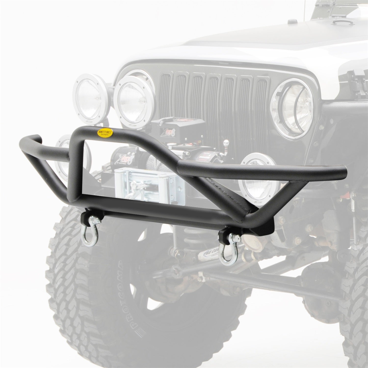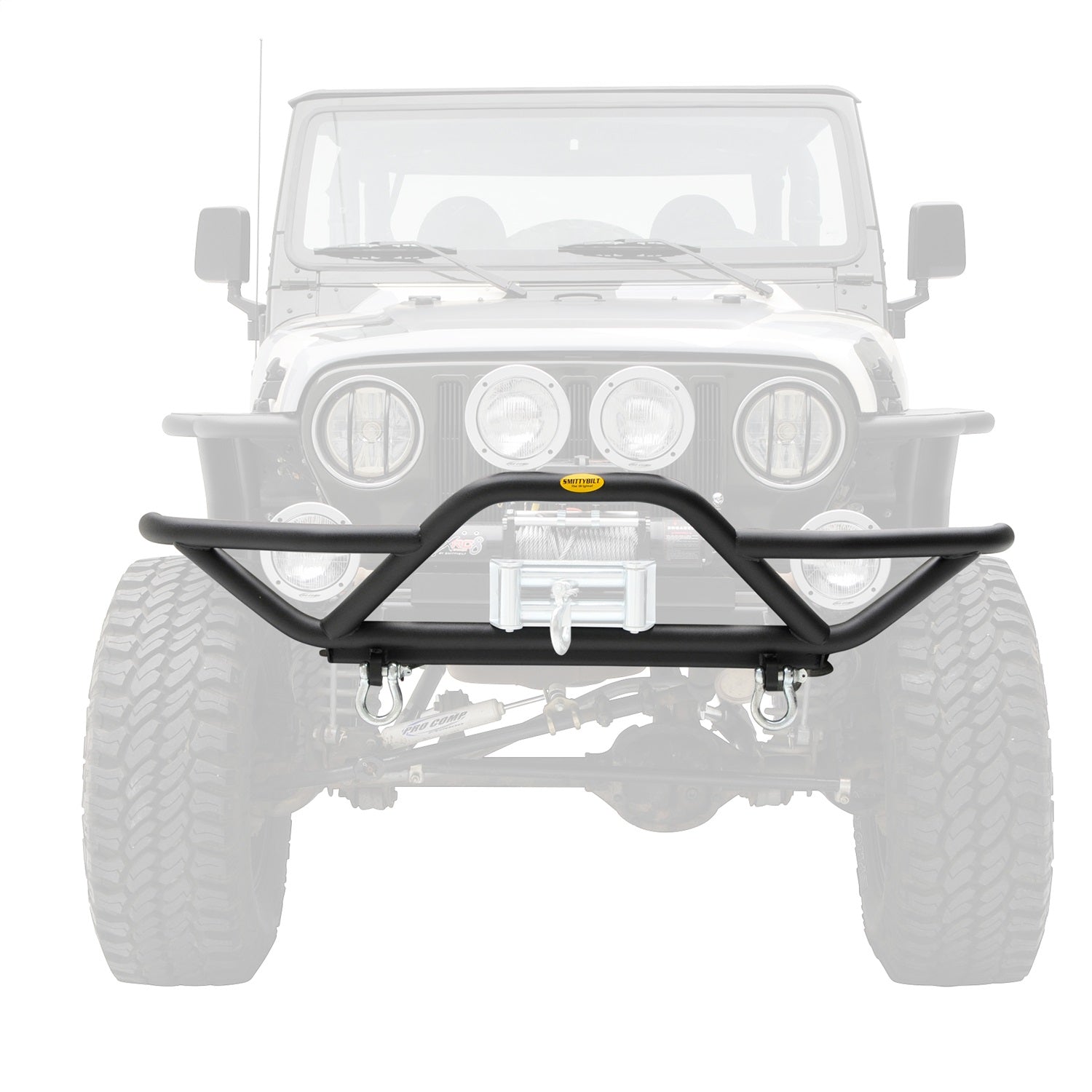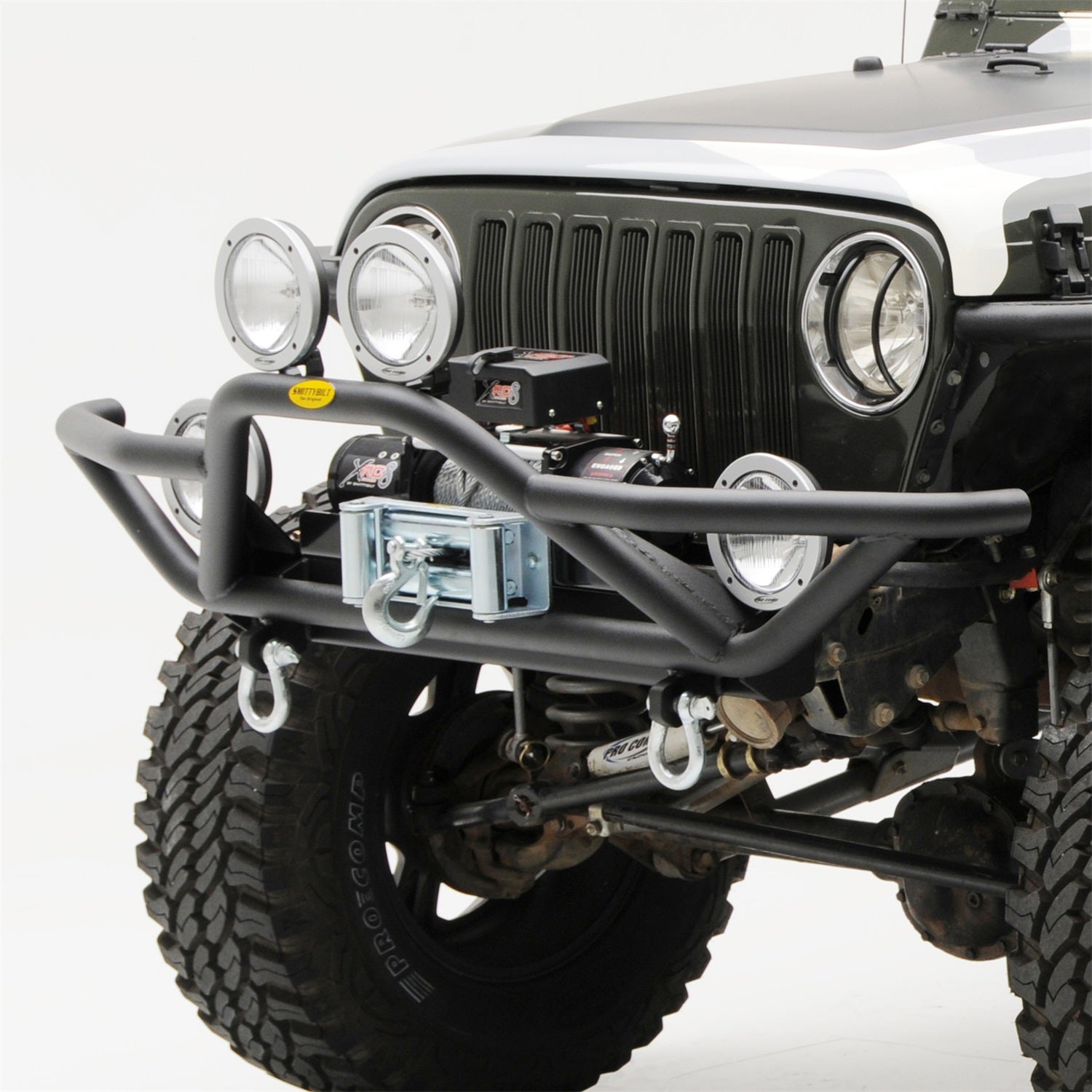 The Smittybilt Rock Crawler Series Front Bumper for 1987-2006 Jeep Wrangler YJ/TJ/LJ is built to handle the toughest off-road conditions. Constructed with durable 2" x .120" tubing and 1/4" steel plate, this bumper features welded D-ring mounts, light tabs, and is winch plate compatible for added functionality. Designed for easy, no-drill installation, its textured black finish and sloping ends provide enhanced tire travel and improved entry and exit angles, ensuring your Jeep is ready for any trail.