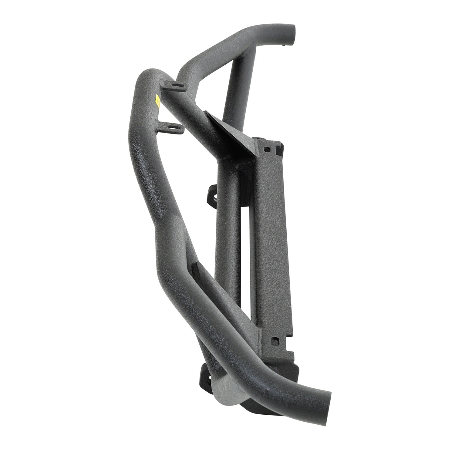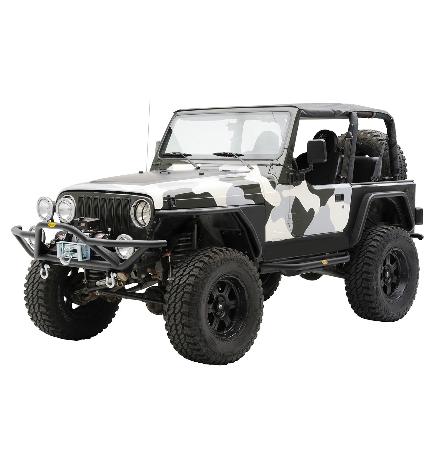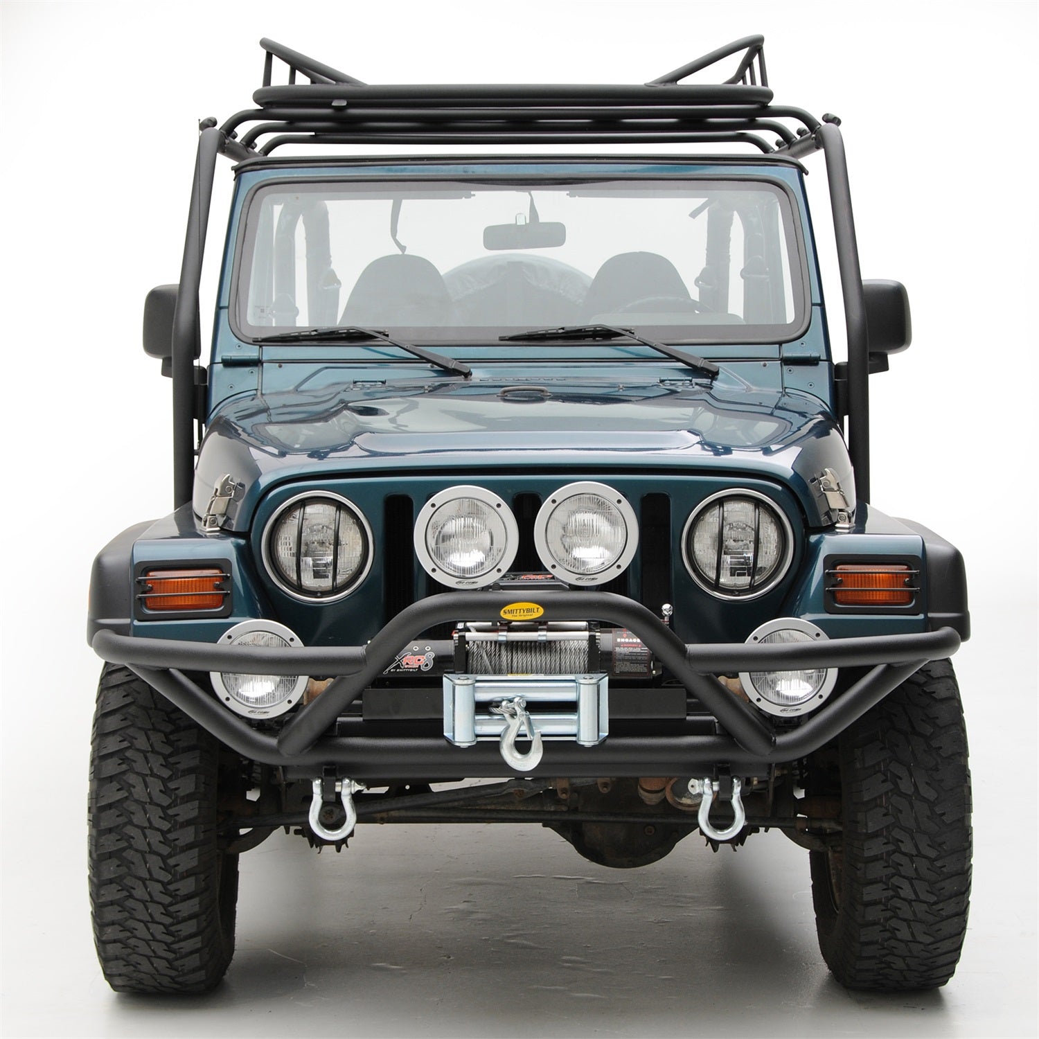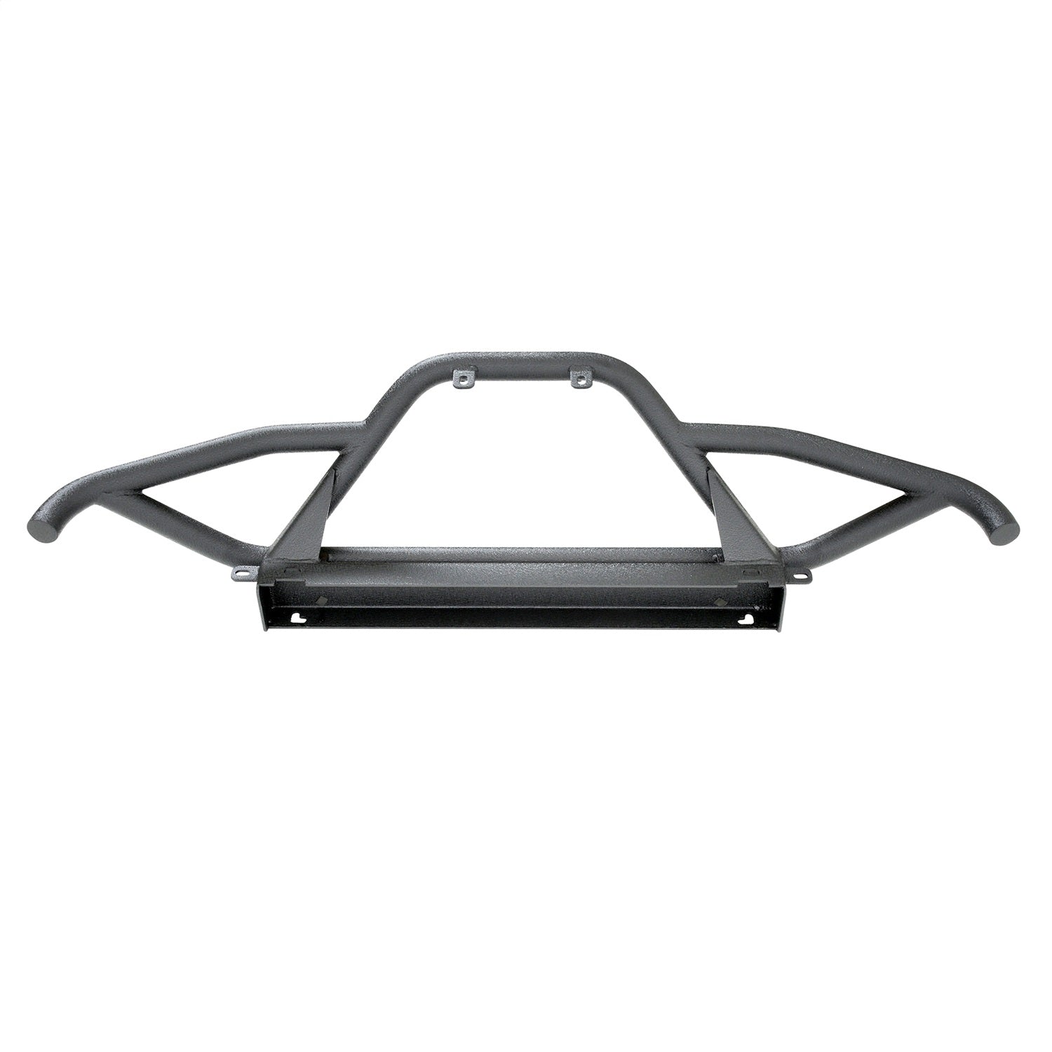 The Smittybilt Rock Crawler Series Front Bumper for 1987-2006 Jeep Wrangler YJ/TJ/LJ is built to handle the toughest off-road conditions. Constructed with durable 2" x .120" tubing and 1/4" steel plate, this bumper features welded D-ring mounts, light tabs, and is winch plate compatible for added functionality. Designed for easy, no-drill installation, its textured black finish and sloping ends provide enhanced tire travel and improved entry and exit angles, ensuring your Jeep is ready for any trail.