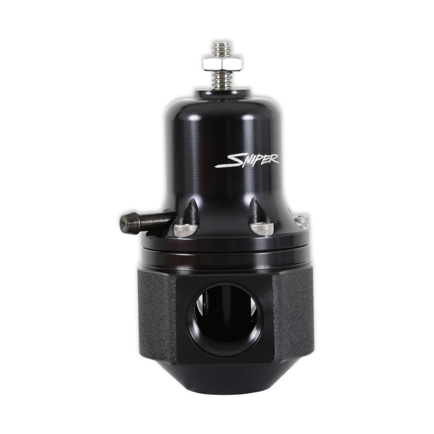 Sniper EFI universal bypass fuel pressure regulators are for use with fuel systems in street or track applications. They feature adjustable base pressure from 40-130 psi, a gauge port, and a boost reference port as well. These regulators are ideal for vehicles/systems where superior flow and pressure control are needed. These regulators are precision machined from 6061-T6 billet aluminum for strength and durability. They feature a black bright dip anodized body and a clear bright dip anodized top for corrosion resistance and good looks.