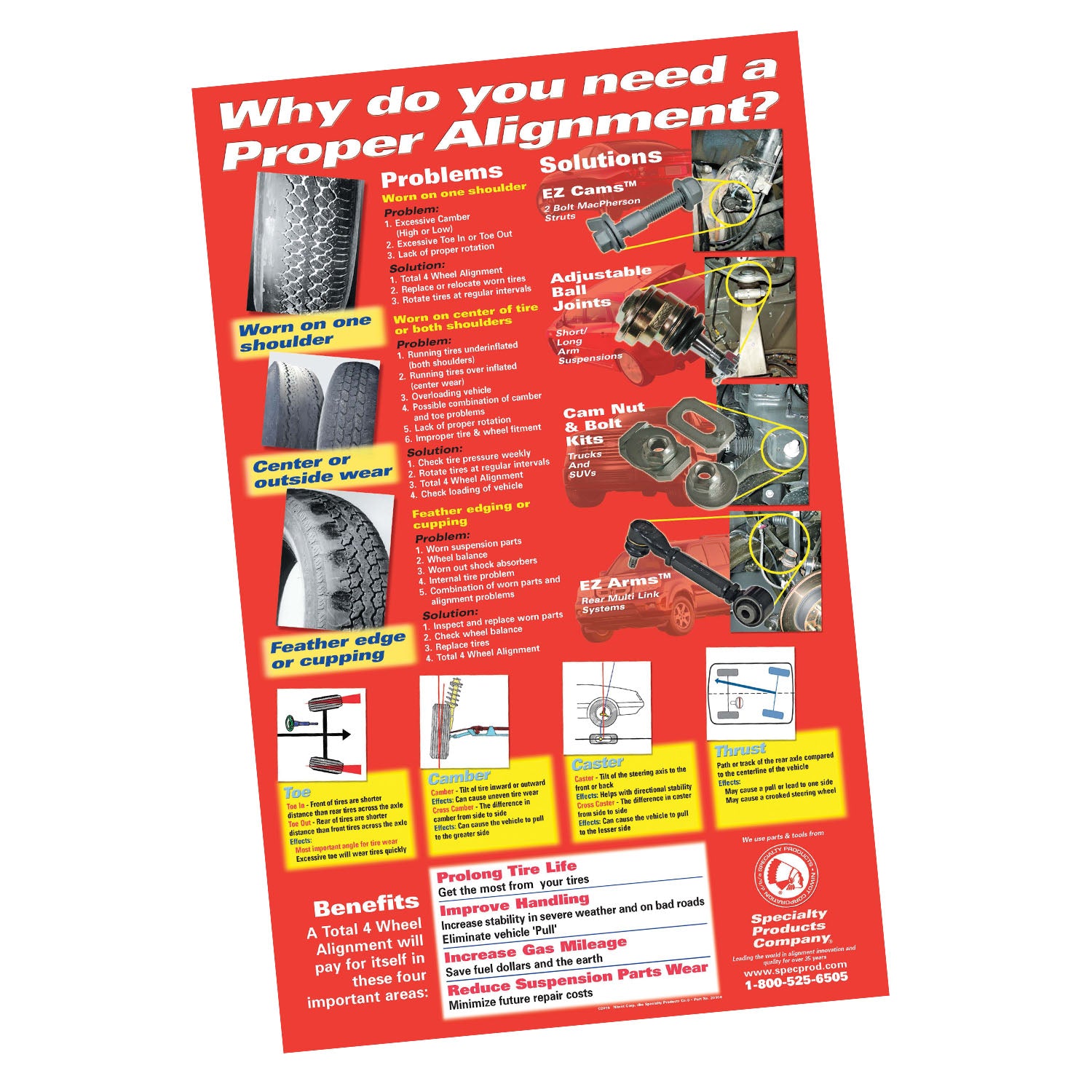 To help your customer sell more alignments, SPC is offering various Point Of Sale items to help make the consumer aware of the importance of a properly aligned vehicle. Our first POS is a 22" X 35" Tire Wear Poster that fits into standard showroom frames. This poster details various types of tire wear, the causes of tire wear, and highlights alignment solutions from Specialty Products and then completes the sale with a list of the benefits of a 4 Wheel Alignment. A quick education tool, this Tire Wear Poster will be a must in alignment and tire shops.