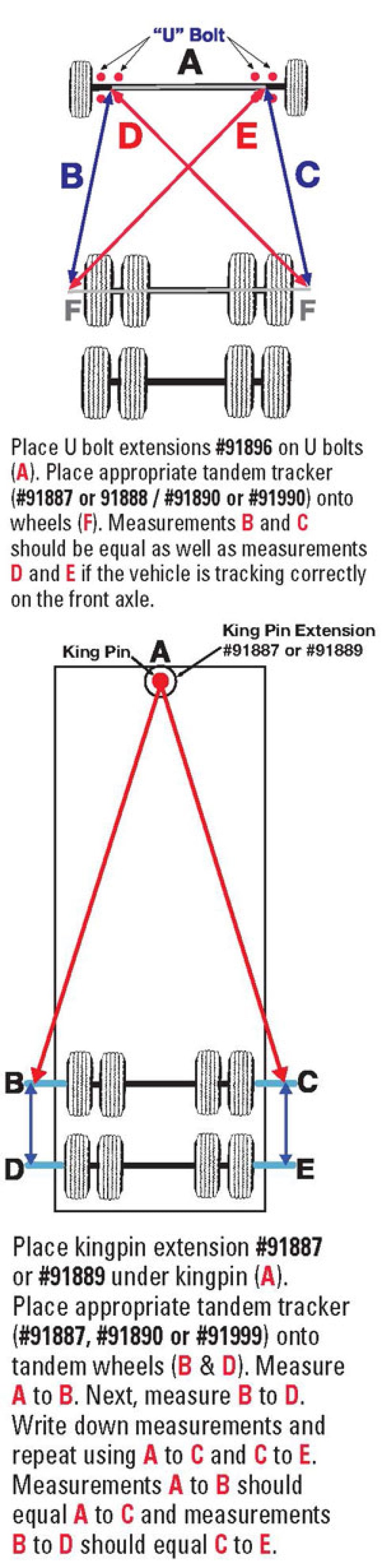 This trailer tracker set for aluminum wheels up to 28", isused to aid in measuring the tracking of the tandem axlesin relationship to the kingpin extension and the front andrear axles on the tandem. They fit on the outside of thewheels so they will not da