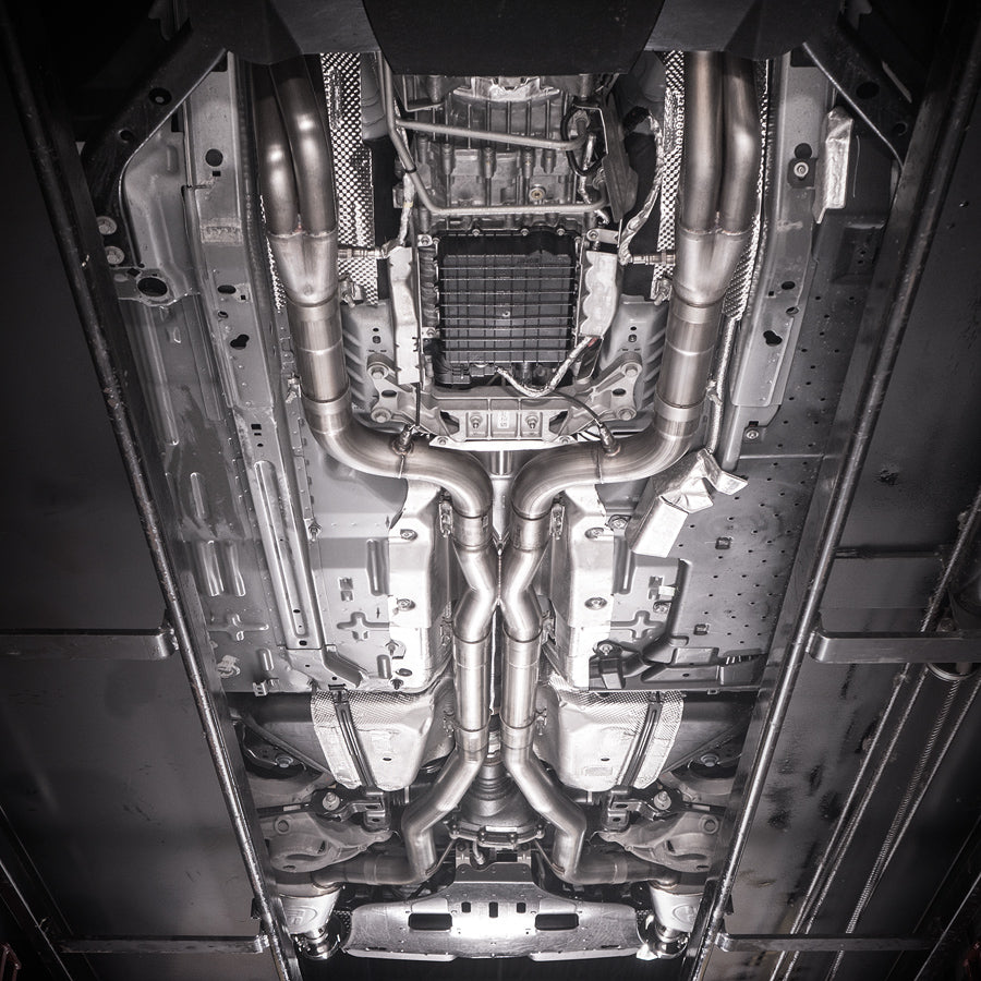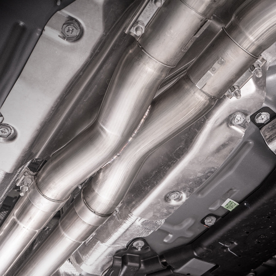 2020 Ford GT500 Legend catback system featuring an x-pipe crossover and polished tips.