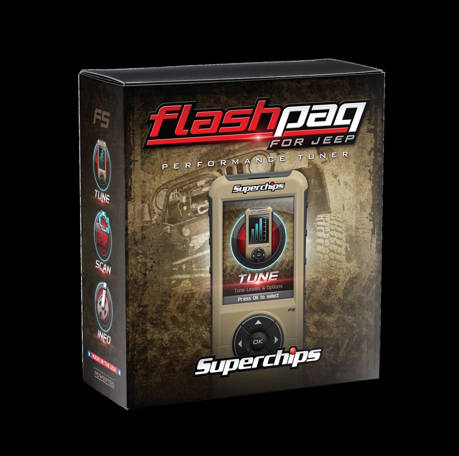 At Superchips, we don't just get it, we live it. The Flashpaq for your Jeep (part no. 3876) is designed for your 2015-2018 JK Wrangler 4x4 and packed with off-road specific features exclusive to Superchips. Flashpaq for Jeep is the number one tuning solution for Jeeps. Our tunes include multiple street- and trail-proven performance levels developed on the streets of Florida all the way out to legendary trails of Moab, Utah; make sure you give our Crawl tune a try! This various altitude testing guarantees optimal performance, regardless of geographic location. Youll find lots of pretenders out there making big claims and false promises. Adjust your speedometer for aftermarket tires or gears, read and clear codes, enjoy our CRAWL tune and more. We pioneered Jeep tuning in 2009 and you can rest assured were keeping the pretenders in our rear view and providing you with Jeep tuning built to contend for the long haul!***This product requires an PCM swap in order to tune your Jeep***PCM Swap Options: Option 1: Cross-ship PCM swap (subject to availability of PCMs). Once you proceed, you will need to set up a PCM shipment and the included pre-authorization to secure that shipment. This process is all online and very simple. Option 2: Send in your factory PCM to be unlocked This free service will be available to you anytime. Please contact technical support to begin. Once we receive your stock PCM, we will quickly unlock it and get it back to you so you can tune with your Flashpaq. CHECK OUT THIS QUICK INSTALL GUIDE FOR MORE SPECIFIC INSTRUCTION** This product has not been tested or validated on right-hand drive Jeep applications or imported (non-American VIN based) Jeep applications. They are not supported by this product.