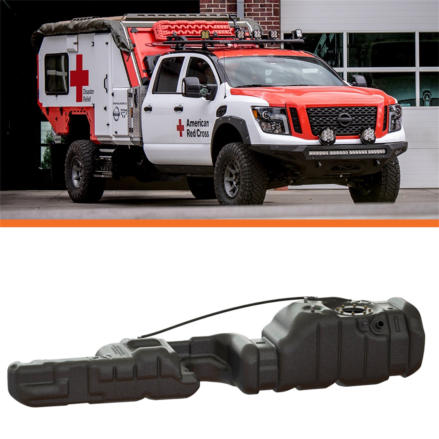 50 Gallon*, extra capacity, extra heavy duty mid-ship replacement fuel tank for 2016-2017 NISSAN Titan XD pickups with Crew Cabs, 6 ft 7 in beds and Cummins engines.Tank comes complete with 2 ea. rear straps, 1 ea. center point mounting system, 1 ea. front mounting bracket for a total of four mounting support points for worry-free installation. It also comes with rollover safety vent valves and all accessories needed for installation. Tapered tank features exclusive low fuel trap design so every gallon can be used, and hangs only 2 ¼' below the bottom of the stock tank. TITAN Tanks' incredibly tough Gen V sending unit mounting system eases installation.This new Nissan tank is made of TITAN's famous military grade, cross-linked polymer (XLHDPE). It's at least ¼' thick and built to outlast all competitors. It's tougher than steel and more durable than aluminum. TITAN routinely tests their products using state-of-the-art computer simulation as well as actual, physical drop tests. They fill their tanks completely and drop them 30 feet onto a steel plate---never losing a drop of liquid. These legendary products are so tough and well-proven that they are backed with a Lifetime Warranty+!For model years 2016-2017. Made in the U.S.A.