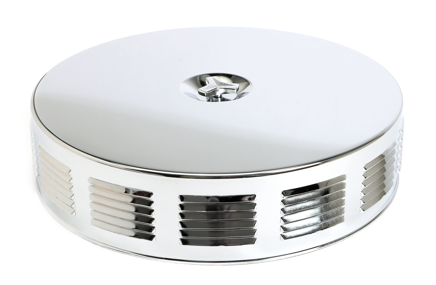 Notes: Louvered in.Corvette Style in. Air Cleaner Set; 14 in. Diameter, 3 in. Tall, 5-1/8 in. Neck- CHROME