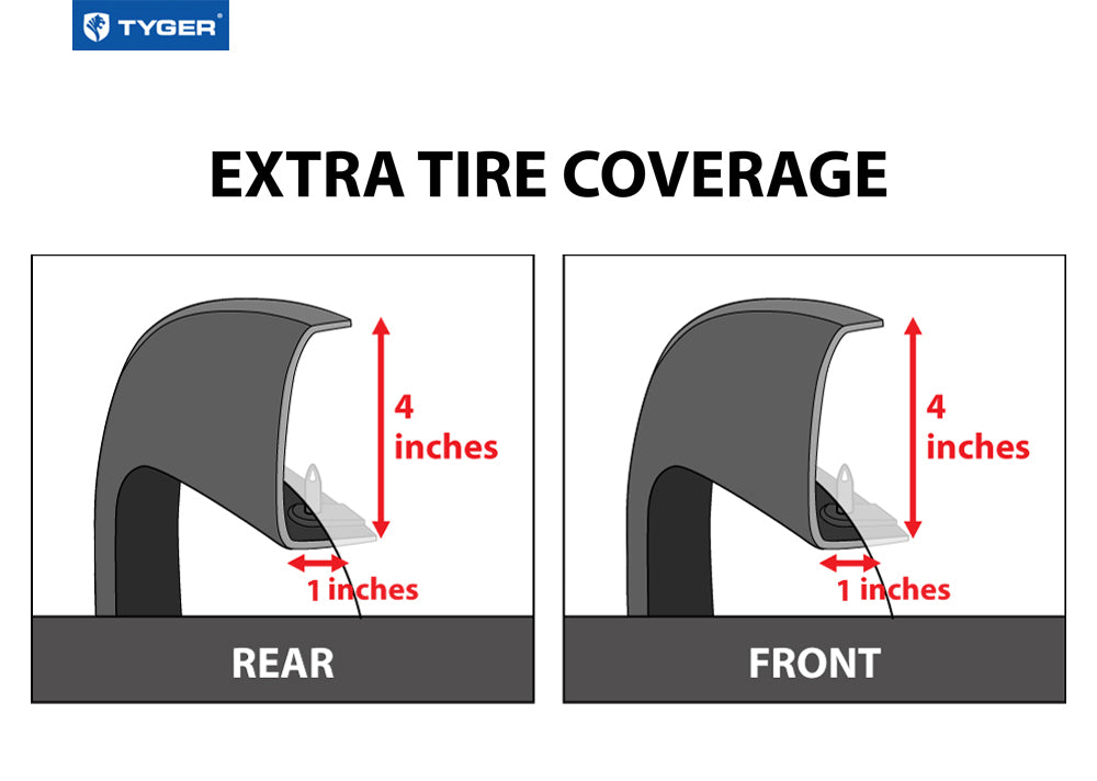 • Dimensions - Flare Height: 4 inch in front and 4 inch in rear. Tire Coverage: 0.75 inch in front and rear.