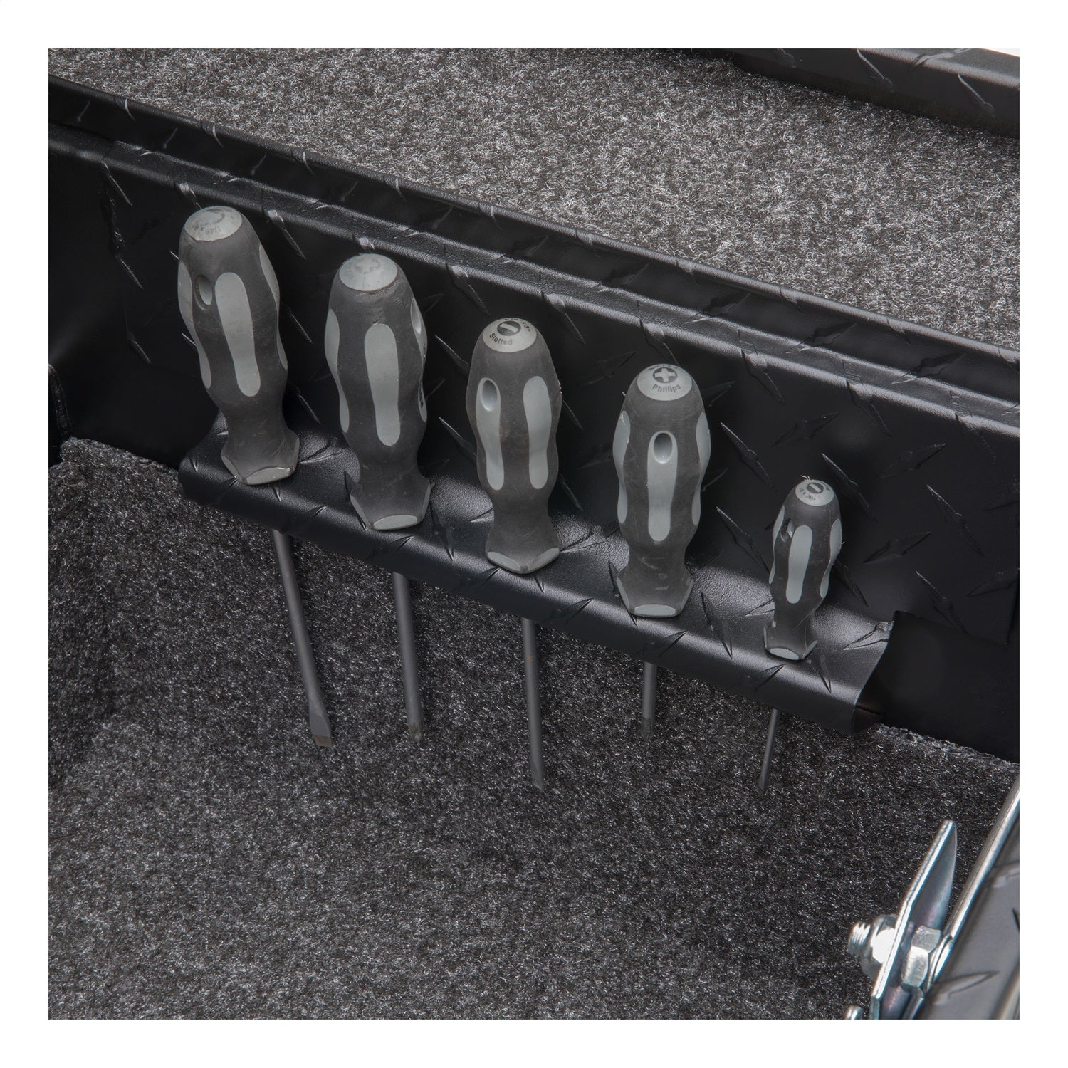 UWS Secure Lock crossover truck tool boxes provide the ultimate in security and convenience, offering you a truck bed tool box unlike any other. It features a unique locking system, an innovative interior and a highly durable design. The Secure Lock truck box operates with two lockable twist handles. These handles are key-operated and allow you to lock the truck tool box from either the driver or passenger side. The two locks also give you the option to lock both sides for maximum security. The lid of the Secure Lock tool box is particularly strong, featuring our patented RigidCore foam-filled design. This gives the lid greater structural integrity and resists bending and warping. Like most UWS tool boxes, this box also features extra-thick aluminum construction, and the tub is welded into a single piece to ensure waterproof protection for your items. It is also equipped with a MicroSeal gasket to keep out dust, grime, moisture and insects. To protect the interior of the Secure Lock tool box, it features a heavy-duty BedRug liner. This protective mat resists dents and damage to the box itself and to your tools and other items, and it helps trap dust and dirt for easy cleanup. The UWS Secure Lock truck tool box offers excellent organization for your tools, featuring an included three-compartment tray and built-in screwdriver holders. The lid is able to open to a complete 90 degrees for easy access to the interior contents, and it is equipped with self-closing struts that automatically close the lid with a slight manual pull, securing the box when your hands are full. The Secure Lock truck tool box is quick and easy to install, and it is available in multiple sizes to provide the perfect fit for your own unique truck bed. Like all UWS products, each Secure Lock crossover truck tool box is proudly assembled right here in the USA for style and long-lasting dependability (NOTE: This product is heavily packaged for parcel shipping).