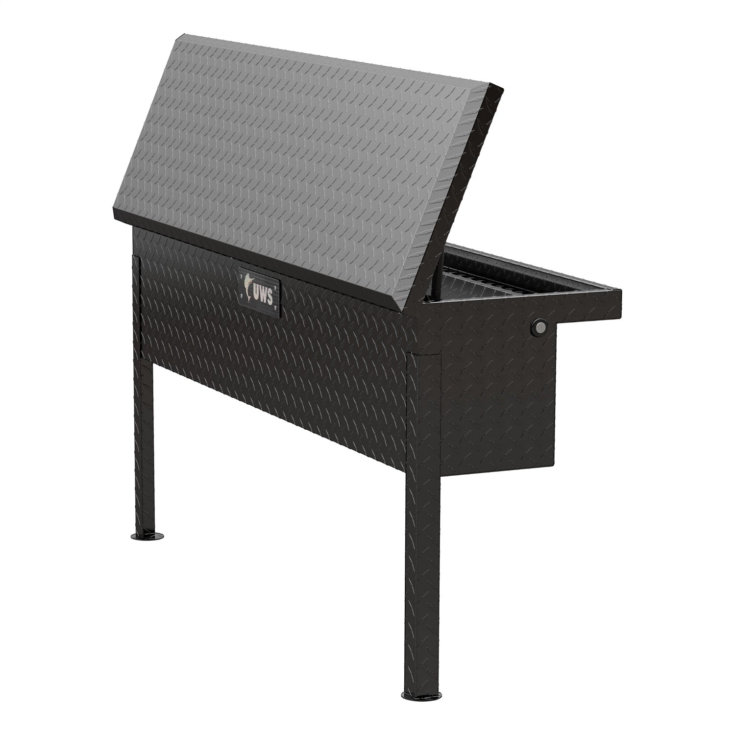 UWS truck side tool boxes provide unbeatable storage and security for your items in the bed of your truck. Each box features a corrosion-resistant aluminum construction, a highly secure stainless steel push-button locking system and a patented RigidCore foam-filled lid -- all to keep your equipment and valuables safe, well-organized and easily accessible whenever needed. Each UWS truck tool box is constructed from extra-thick aluminum for increased structural strength. The tub is welded together into a single piece for weather resistance and to easily hold heavy tools and other items. The lid features a patented RigidCore foam-filled design, sandwiched between two aluminum plates. This greatly increases the strength of the lid and helps prevent bending and warping, making operation very smooth. This particular truck tool box features a low profile for a more streamlined look and to match UWS low-profile crossover tool boxes. The locking mechanism of the UWS truck side tool box provides excellent security for your items, featuring a stainless steel, key-operated push-button for long-lasting corrosion resistance. For solid protection against the elements, the lid also has a MicroSeal gasket, blocking moisture, dust and insects from getting inside and damaging your valuables. The lid also opens to nearly 90 degrees for easier access, and it is equipped with self-opening struts for convenient operation when your hands are full. UWS truck tool boxes are available in multiple sizes to accommodate any storage need. Like all UWS products, each one is proudly assembled right here in the USA for style and long-lasting dependability.