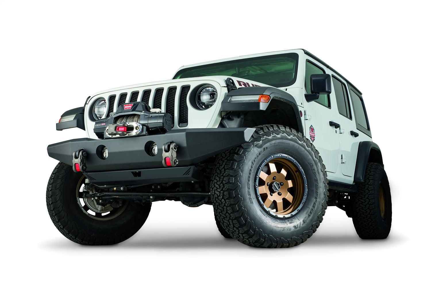 Full Width; One Piece Design; Direct-Fit; Mounting Hardware Included; Without Grille Guard; With External Winch Mount; With D-Ring Mounts; With OEM Style Fog Light Cutouts; Powder Coated Black Steel; With Jacking Points