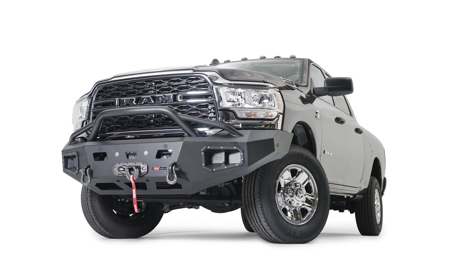 WARN Ascent HD front bumper for RAM 2500/3500 featuring a pre-runner style grille guard and integrated winch mount that will accept large or mid-frame winches up to 18,000 lbs in capacity.