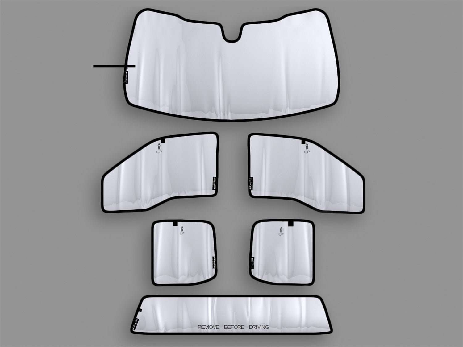 WeatherTech SunShade Full Vehicle Kits help keep your entire vehicle's interior temperatures down while protecting it from the sun's damaging effects. SunShade Full Vehicle Kits include 4 or 6 pieces depending on the vehicle model. SunShade kits are custom-fit, and when properly installed, will remain snug in each window opening on the vehicle. Each SunShade features a foam core, which makes for easy handling and a sturdy fit. After use, simply pull on the your shade's pull tabs and roll all pieces together using the easy roll up and store Hook & Loop strap. Full Vehicle Kits only available in select vehicles