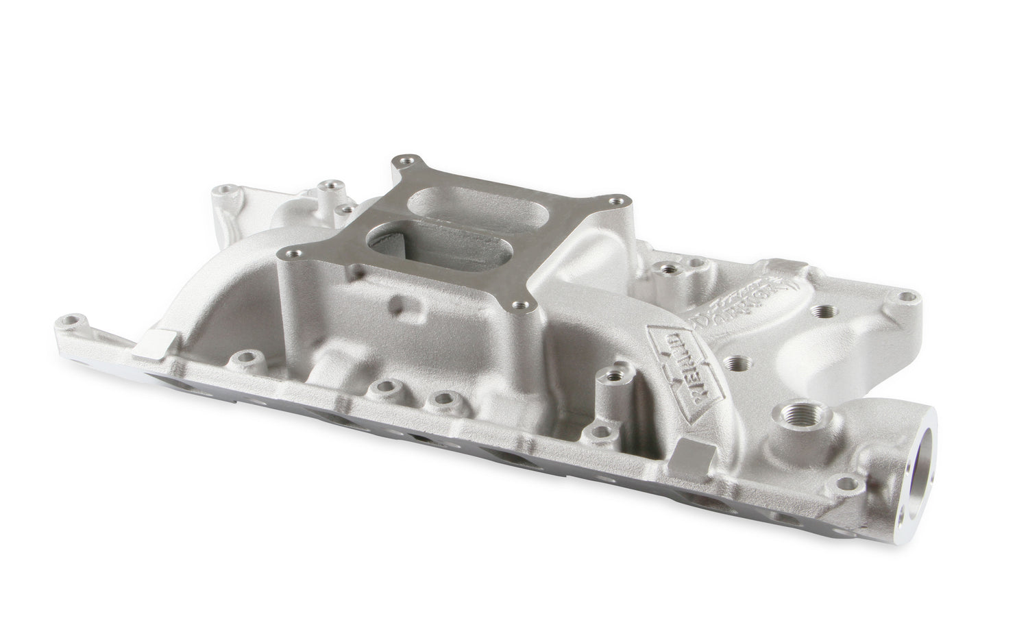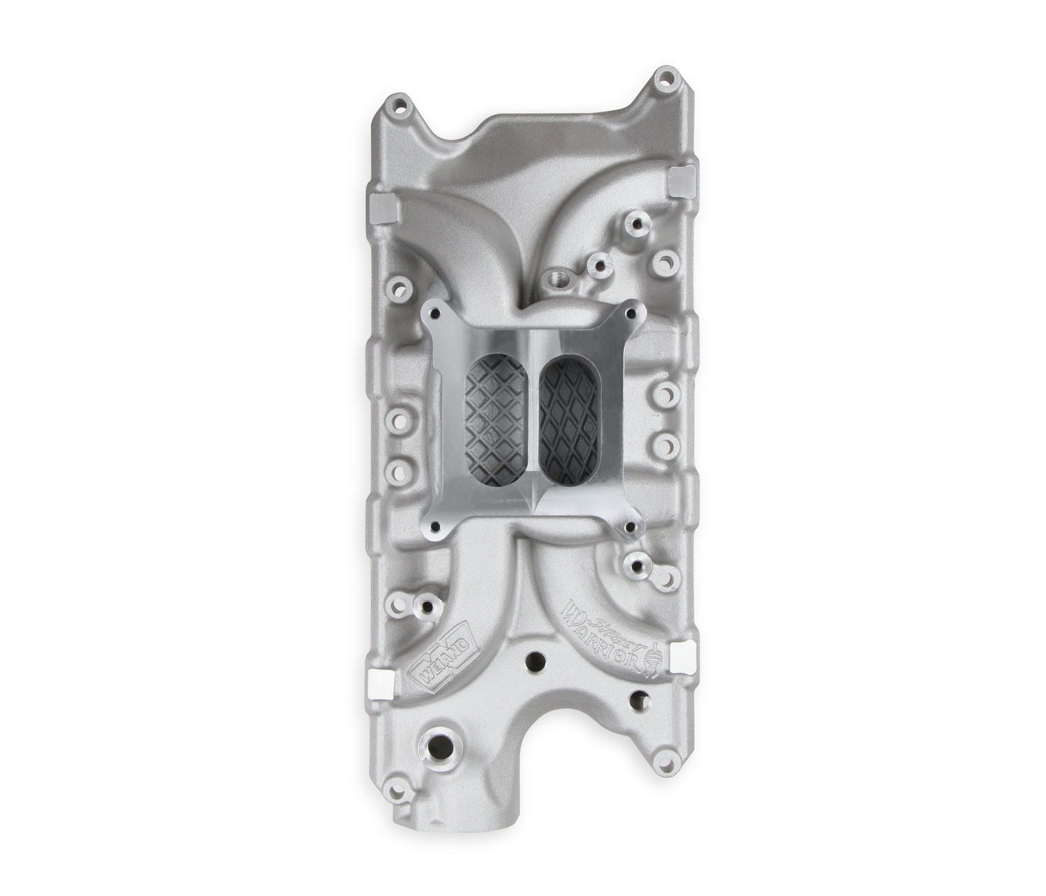 Street Warrior™ Intake Manifold; Lower; Power Band Idle-5500 RPM; Low Rise/Dual Plane; Square Bore Carb Mounting Flange; 3.82 in. Front H/4.75 in. Rear Height; Satin Finish;