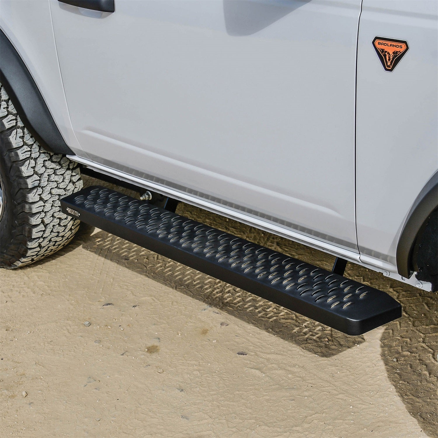 Westins Grate Steps Running Boards are engineered to provide maximum traction without sacrificing style. The 6 1/4in. step surface width features an aggressive 1/4in. high punched tread allowing traction in any weather condition. The unique serrated edges help clean dirt, snow and mud off your boots to keep truck cab clean. Grate Steps Running Boards feature stylishly formed and fully welded ends with a custom die-cast riveted logo badge. E-coated base coat provides long lasting corrosion protection which far surpasses that of the competition. Solid 1-piece construction makes the Grate Steps Running Boards ideal for construction, commercial, vans and utility use. Available in universal lengths (54in., 68in., 75in., 79in., 83in., 86in. and 90in.) with vehicle specific mount kit required, sold separately. Available in textured black finish.