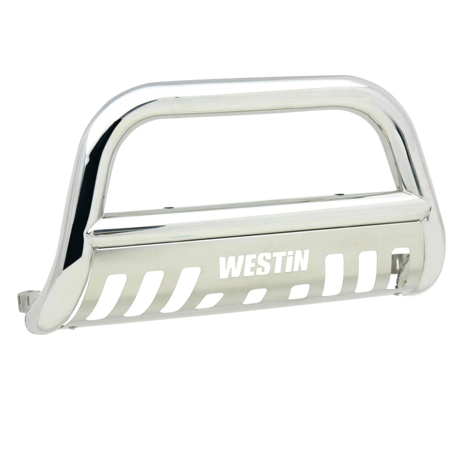 Westin(TM) E-Series Bull Bars are a front-end light bar designed for trucks and larger model SUVs. It is made of 3 diameter polished stainless steel tube. It mounts utilizing existing vehicle mounting points and installation does not require any drilling to the vehicle frame. Comes complete with mounting kit the Westin(TM) E-Series Bull Bar provides a mounting point for 2 auxiliary lights up to 6 in diameter. It features a die-cut Westin(TM) block logo design on the stainless steel skid plate unique to the Westin(TM) E-Series Bull Bar.