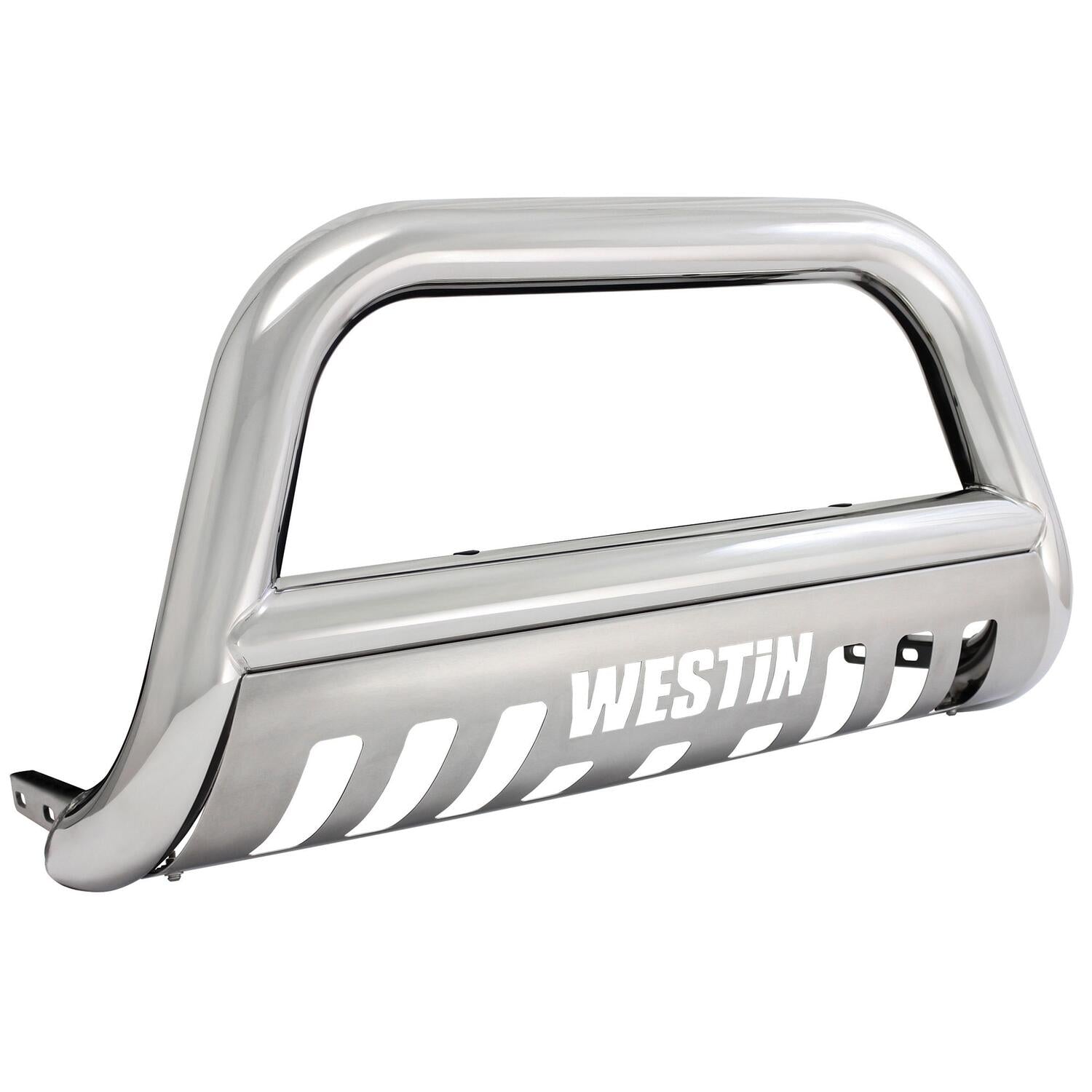 Westin(TM) E-Series Bull Bars are a front-end light bar designed for trucks and larger model SUVs. It is made of 3 diameter polished stainless steel tube. It mounts utilizing existing vehicle mounting points and installation does not require any drilling to the vehicle frame. Comes complete with mounting kit the Westin(TM) E-Series Bull Bar provides a mounting point for 2 auxiliary lights up to 6 in diameter. It features a die-cut Westin(TM) block logo design on the stainless steel skid plate unique to the Westin(TM) E-Series Bull Bar.