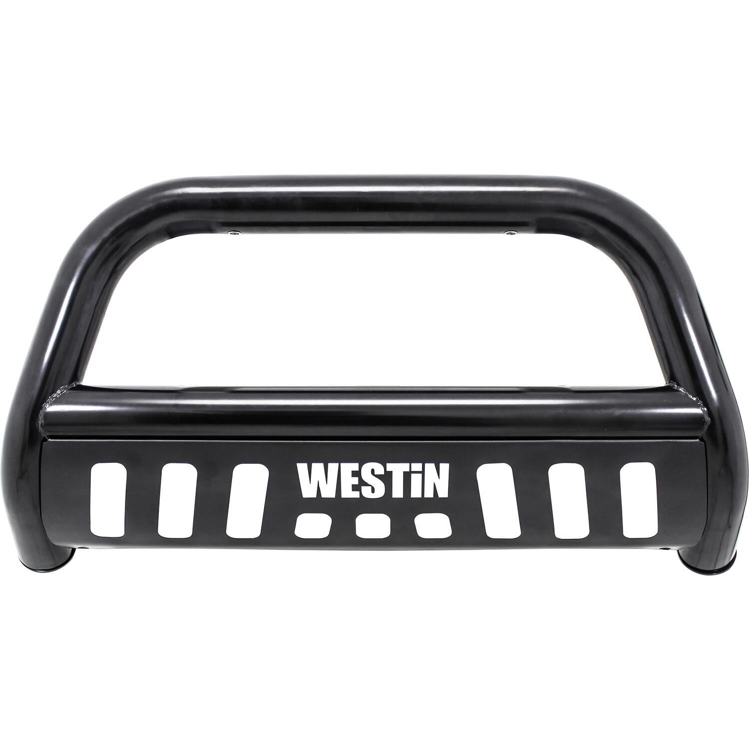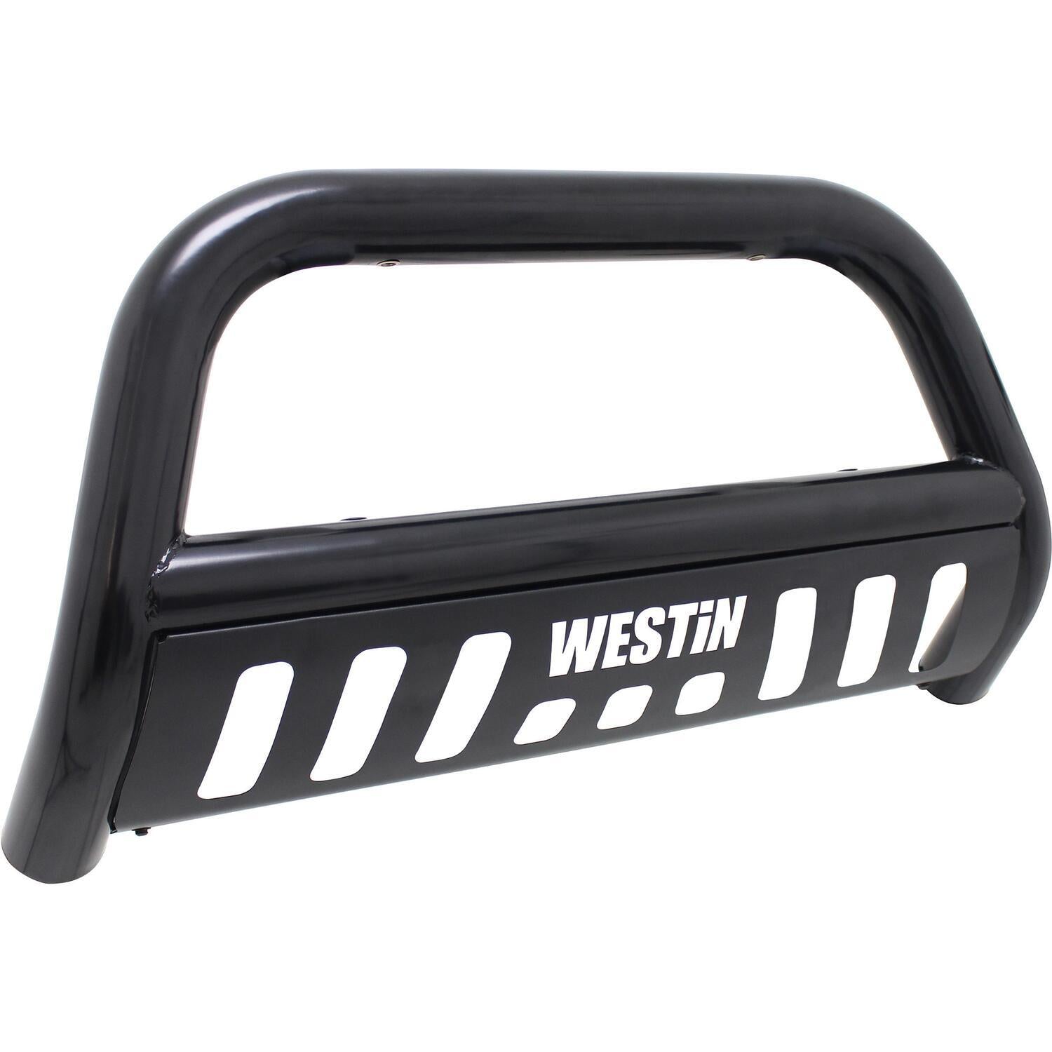 Westins E-Series Bull Bar is a front-end light bar designed for trucks and larger model SUVs. It mounts to the vehicles existing mounting points with no drilling required and comes complete with vehicle specific mount kit. It also features mounting points for 2 auxiliary lights up to 6 inches in diameter. The E-Series Bull Bar features a laser cut Westin block letter logo design on the skid plate. Available in black powder coated e-coated steel with a textured black skid plate backed by a 3 year warranty. Optional license plate bracket is available.