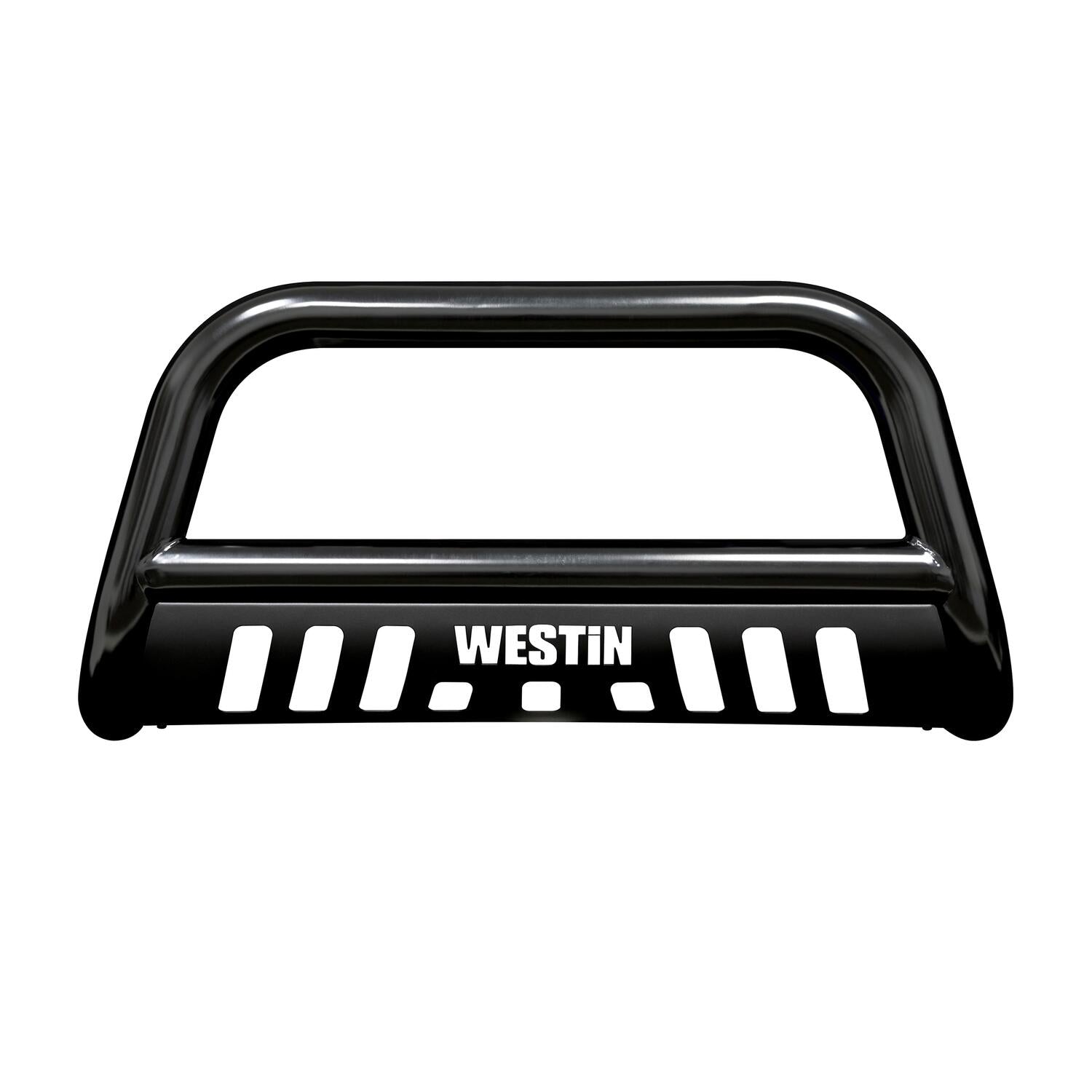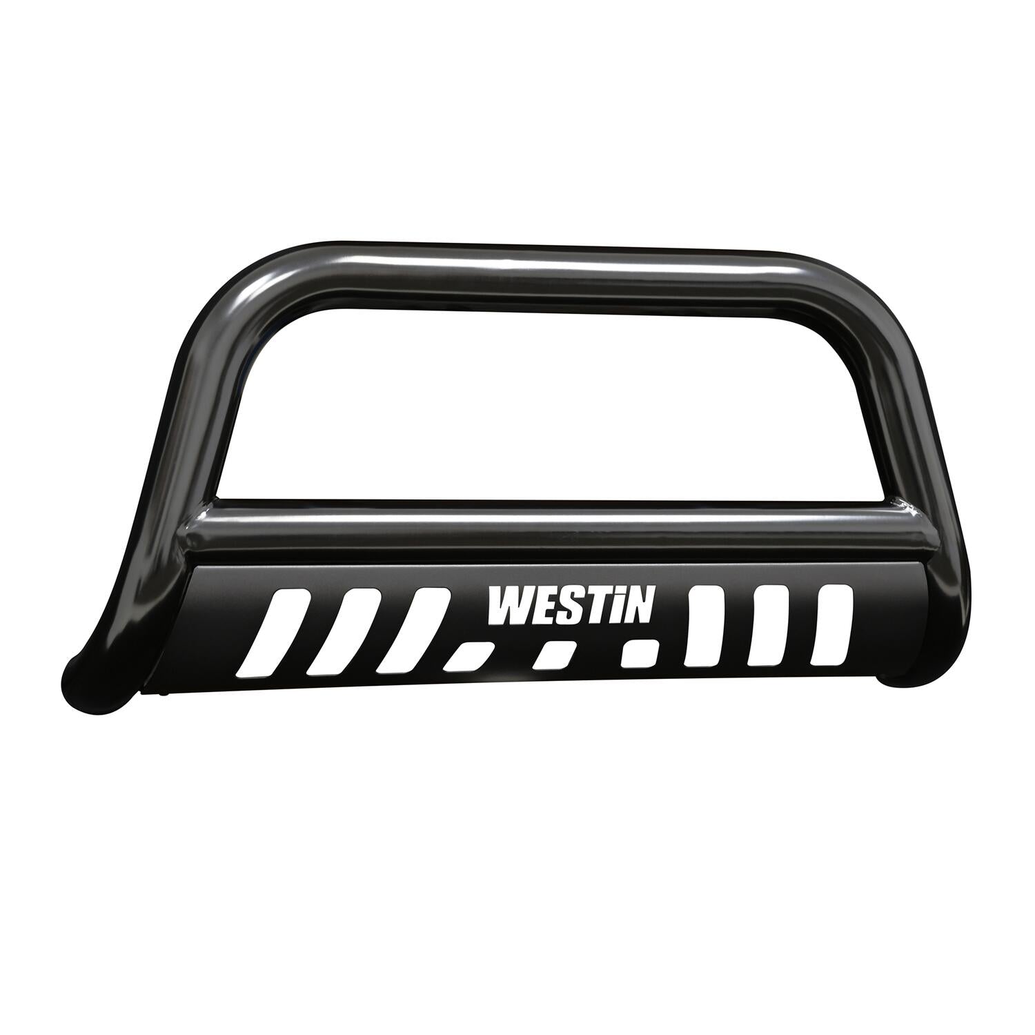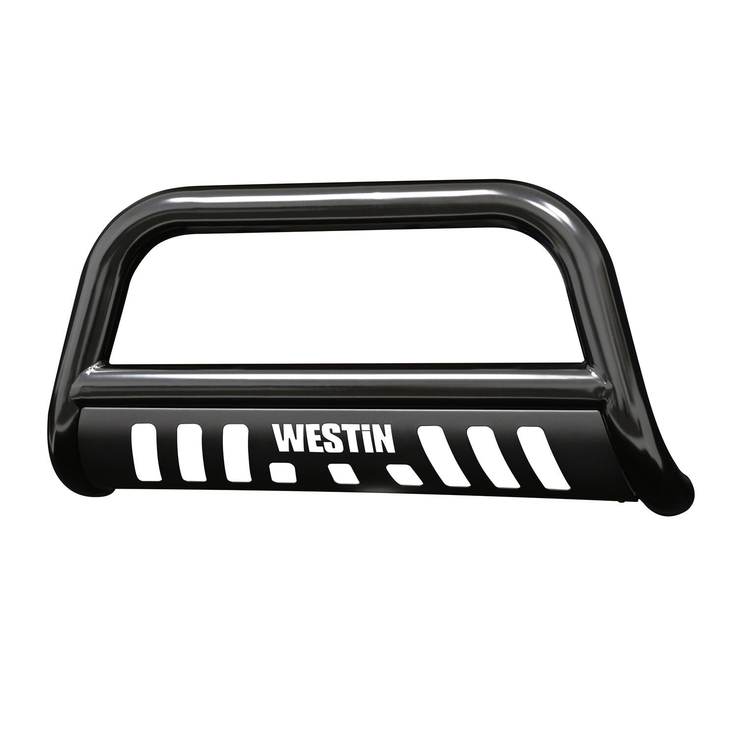 Westins E-Series Bull Bar is a front-end light bar designed for trucks and larger model SUVs. It mounts to the vehicles existing mounting points with no drilling required and comes complete with vehicle specific mount kit. It also features mounting points for 2 auxiliary lights up to 6 inches in diameter. The E-Series Bull Bar features a laser cut Westin block letter logo design on the skid plate. Available in black powder coated e-coated steel with a textured black skid plate backed by a 3 year warranty. Optional license plate bracket is available.